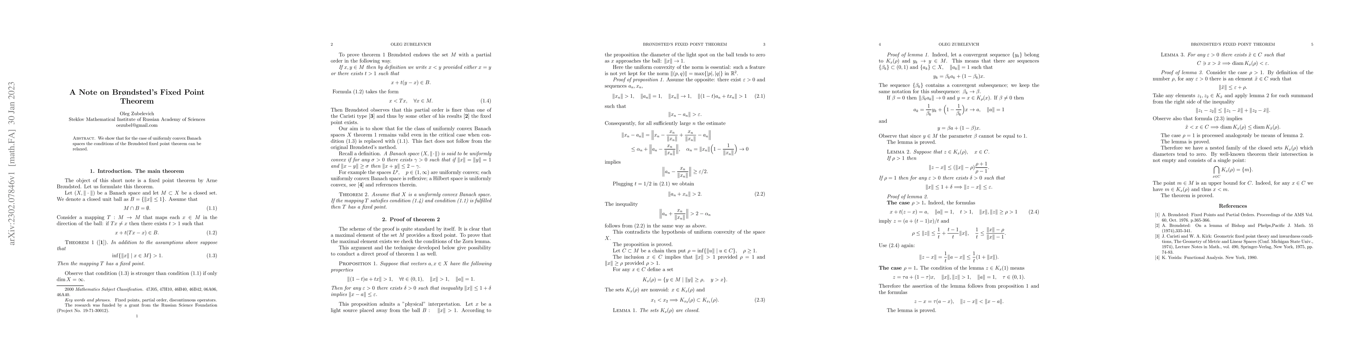 Summary: This paper demonstrates that the conditions of Brondsted's fixed point theorem can be relaxed in uniformly convex Banach spaces, providing a broader applicability of the theorem.