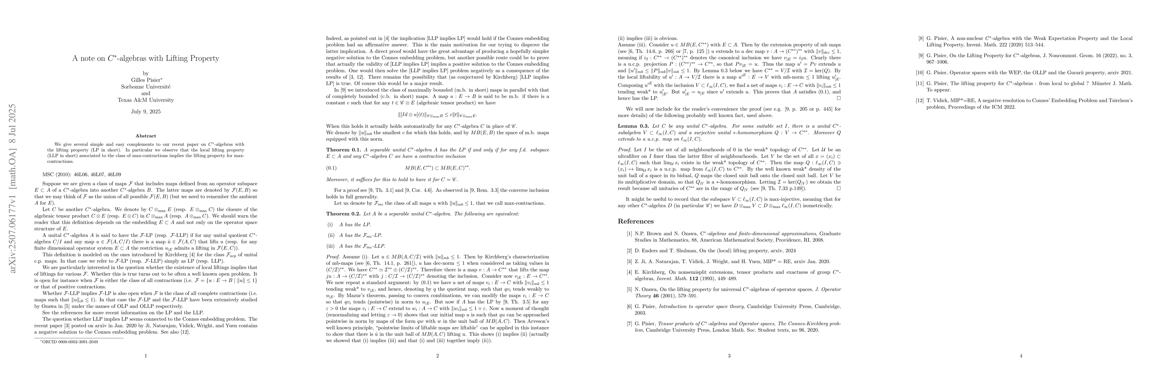 We give several simple and easy complements to our recent paper on $C^*$-algebras with the lifting property (LP in short). In particular we observe that the local lifting property (LLP in short) associated to the class of max-contractions implies the lifting property for max-contractions.