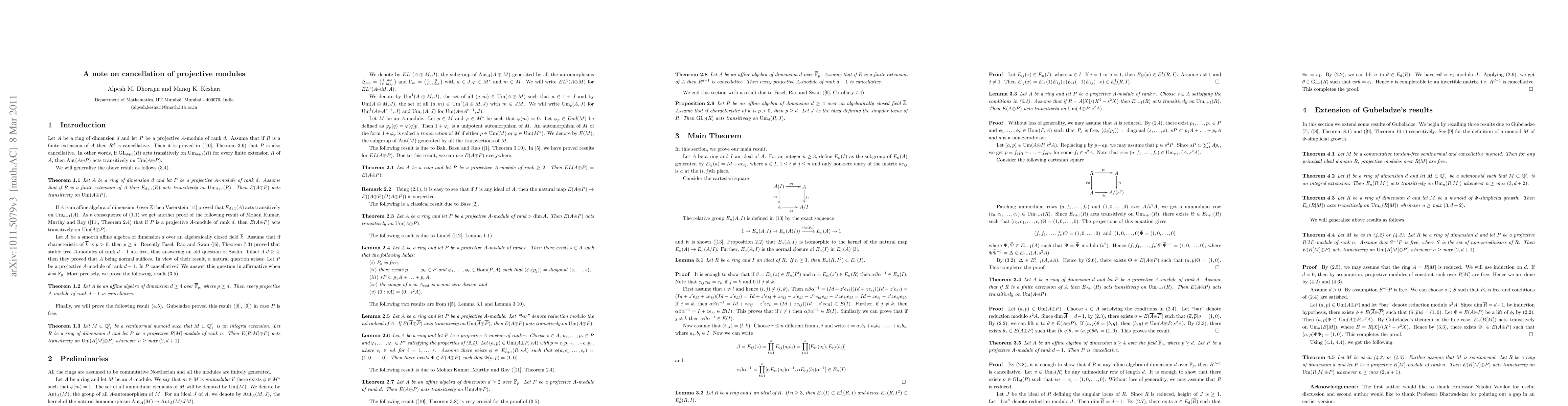 Let $A$ be a ring of dimension $d$. Assume that for every finite extension ring $R$ of $A$, E_{d+1}(R) acts transitively on Um_{d+1}(R). Then we prove that E(A\oplus P) acts transitively on Um(A\oplus P), for any projective A-module P of rank d. As a consequence of this, we generalise some results of Gubeladze.