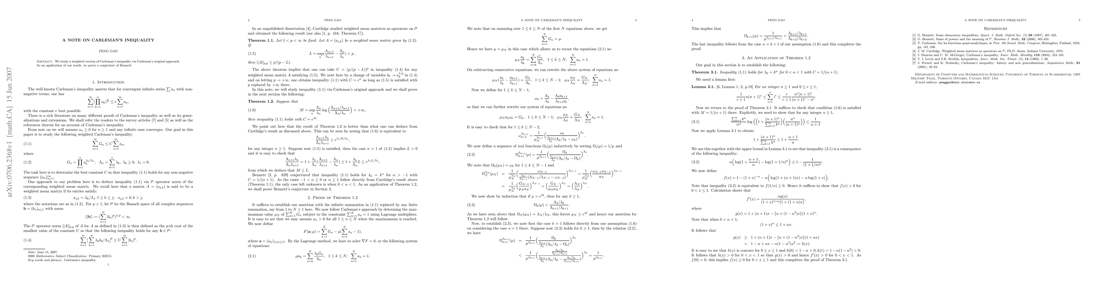 Summary: This paper explores a weighted variant of Carleman's inequality using Carleman's original methodology and applies the findings to prove Bennett's conjecture.