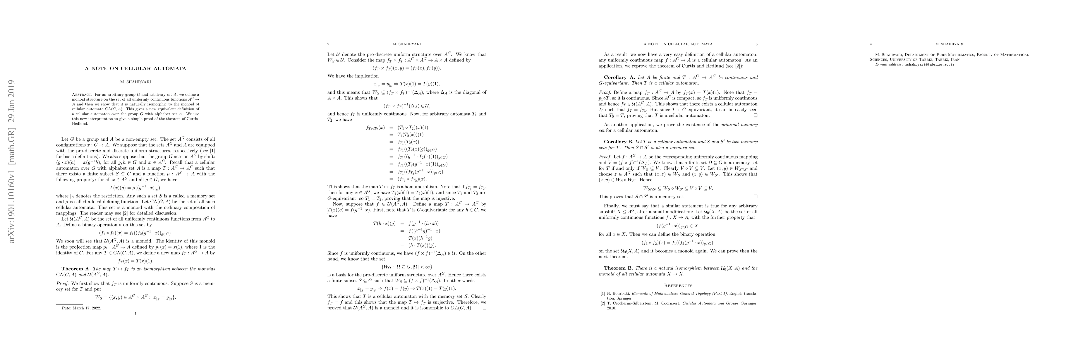 For an arbitrary group $G$ and arbitrary set $A$, we define a monoid structure on the set of all uniformly continuous functions $A^G\to A$ and then we show that it is naturally isomorphic to the monoid of cellular automata $\mathrm{CA}(G, A)$. This gives a new equivalent definition of a cellular automaton over the group $G$ with alphabet set $A$. We use this new interpretation to give a simple proof of the theorem of Curtis-Hedlund.