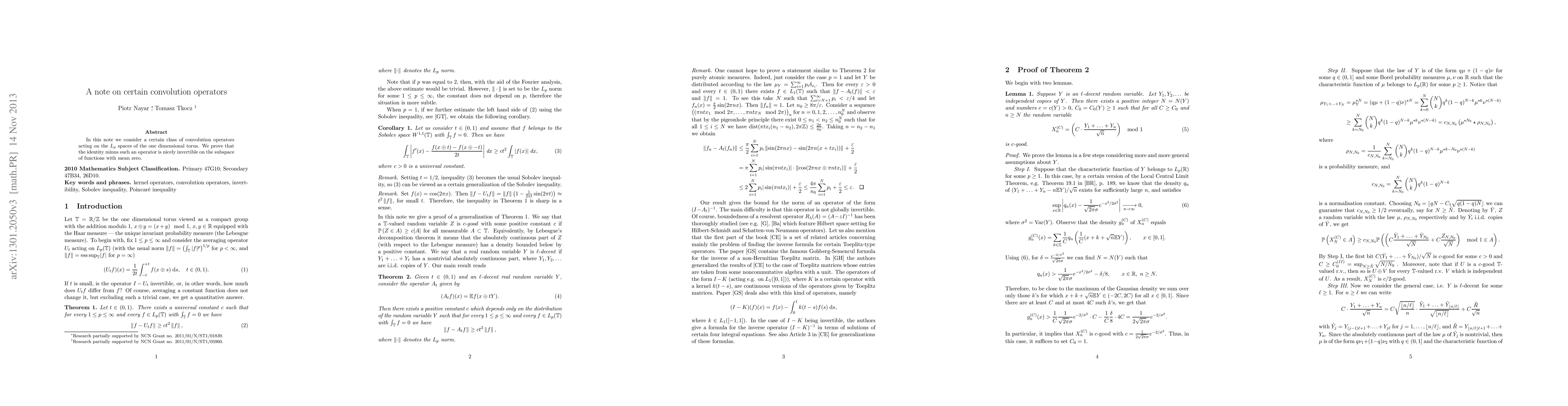 Summary: This paper examines a specific class of convolution operators on L_p spaces of the one-dimensional torus, demonstrating that the identity minus such an operator is invertible on the subspace of mean zero functions. The study highlights the operator's invertibility under these conditions.