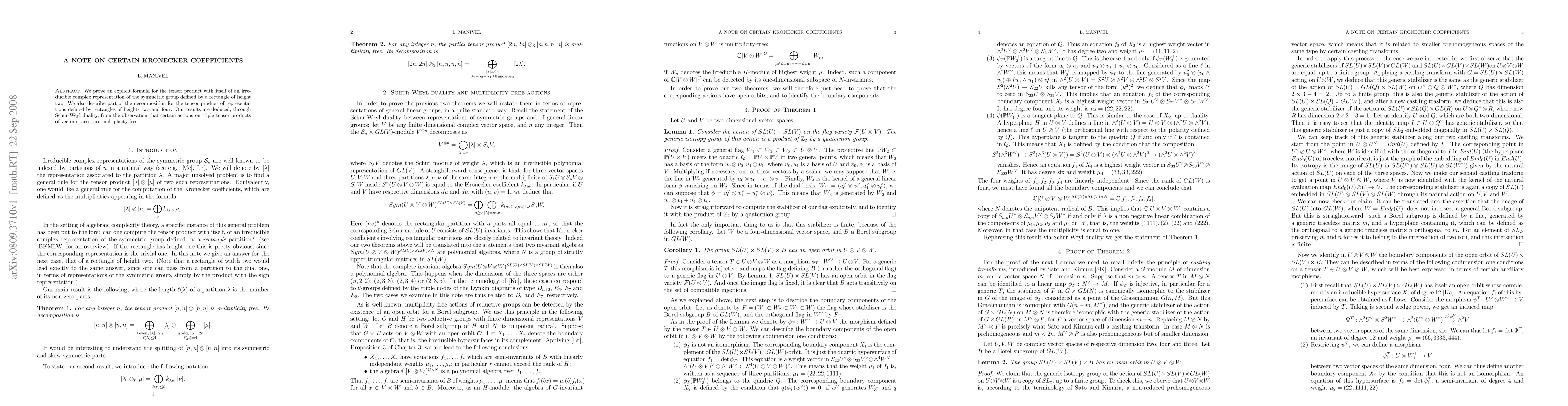 We prove an explicit formula for the tensor product with itself of an irreducible complex representation of the symmetric group defined by a rectangle of height two. We also describe part of the decomposition for the tensor product of representations defined by rectangles of heights two and four. Our results are deduced, through Schur-Weyl duality, from the observation that certain actions on triple tensor products of vector spaces, are multiplicity free.