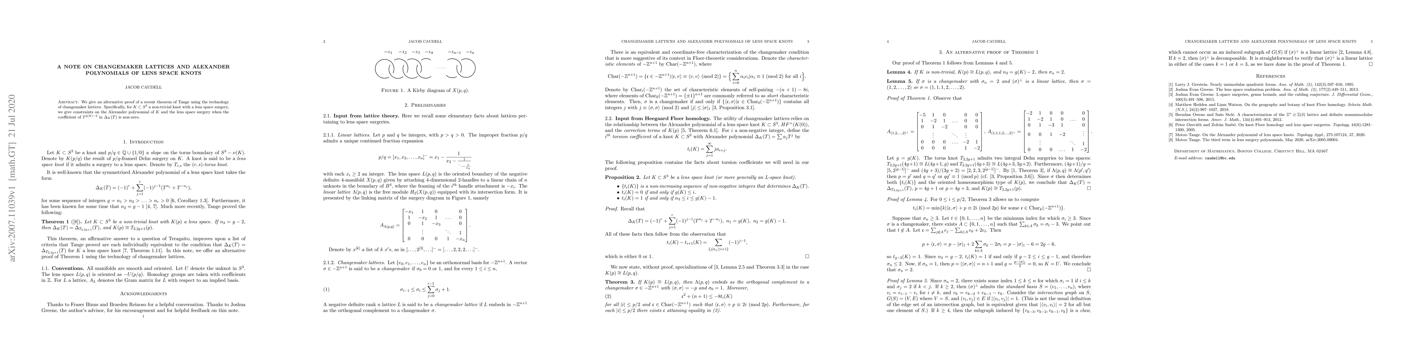 This paper provides an alternative proof for Tange's theorem using changemaker lattices, establishing constraints on the Alexander polynomial of lens space knots when the coefficient of $T^{g(K)-2}$ in $\Delta_K(T)$ is non-zero.