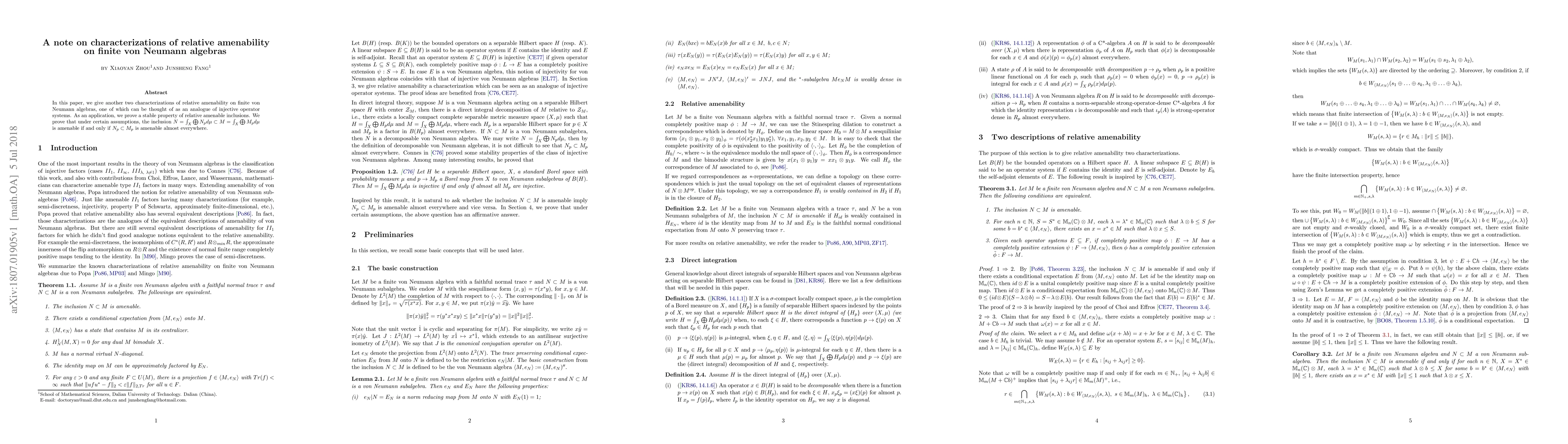 In this paper, we give another two characterizations of relative amenability on finite von Neumann algebras, one of which can be thought of as an analogue of injective operator systems. As an application, we prove a stable property of relative amenable inclusions. We prove that under certain assumptions, the inclusion $N=\int_{X} \bigoplus N_{p} d \mu\subset M=\int_{X} \bigoplus M_{p} d \mu$ is amenable if and only if $N_p\subset M_p$ is amenable almost everywhere.