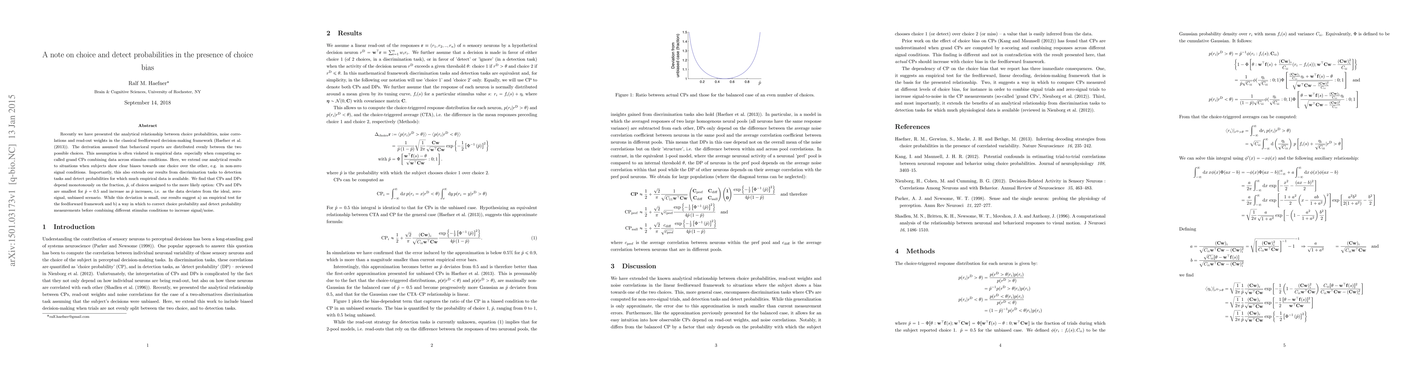 Recently we have presented the analytical relationship between choice probabilities, noise correlations and read-out weights in the classical feedforward decision-making framework (Haefner et al. 2013). The derivation assumed that behavioral reports are distributed evenly between the two possible choices. This assumption is often violated in empirical data - especially when computing so-called grand CPs combining data across stimulus conditions. Here, we extend our analytical results to situations when subjects show clear biases towards one choice over the other, e.g. in non-zero signal conditions. Importantly, this also extends our results from discrimination tasks to detection tasks and detect probabilities for which much empirical data is available. We find that CPs and DPs depend monotonously on the fraction, p, of choices assigned to the more likely option: CPs and DPs are smallest for p equal to 0.5 and increase as p increases, i.e. as the data deviates from the ideal, zero-signal, unbiased scenario. While this deviation is small, our results suggest a) an empirical test for the feedforward framework and b) a way in which to correct choice probability and detect probability measurements before combining different stimulus conditions to increase signal/noise.