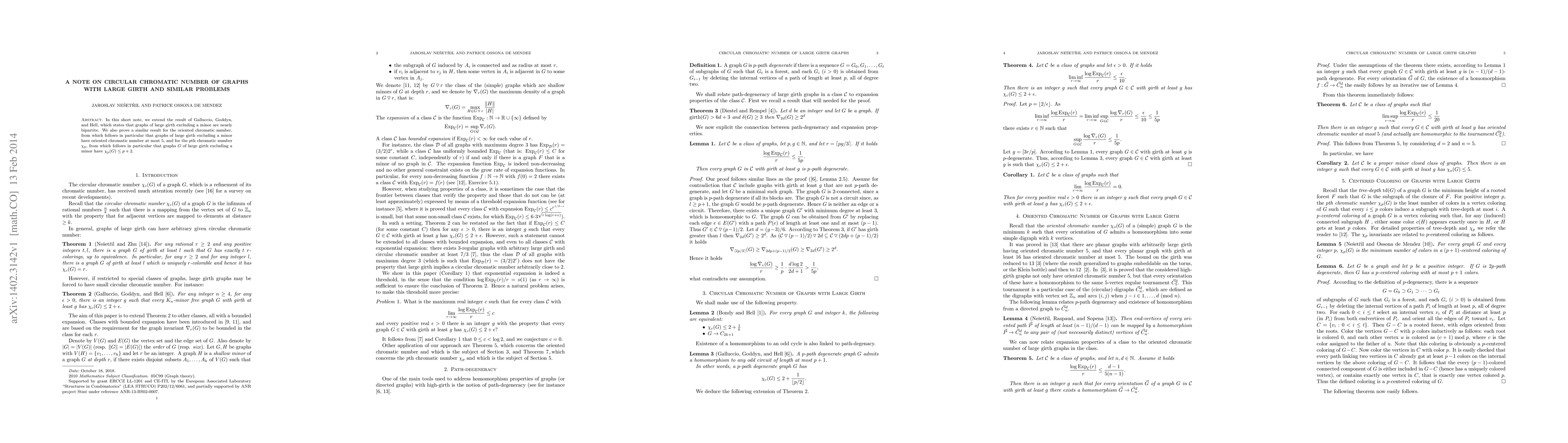 Summary: This paper extends results on the circular chromatic number for graphs with large girth, proving that such graphs excluding a minor are nearly bipartite and have an oriented chromatic number of at most $5$, as well as a $p$th chromatic number $\chi_p(G)\leq p+2$.