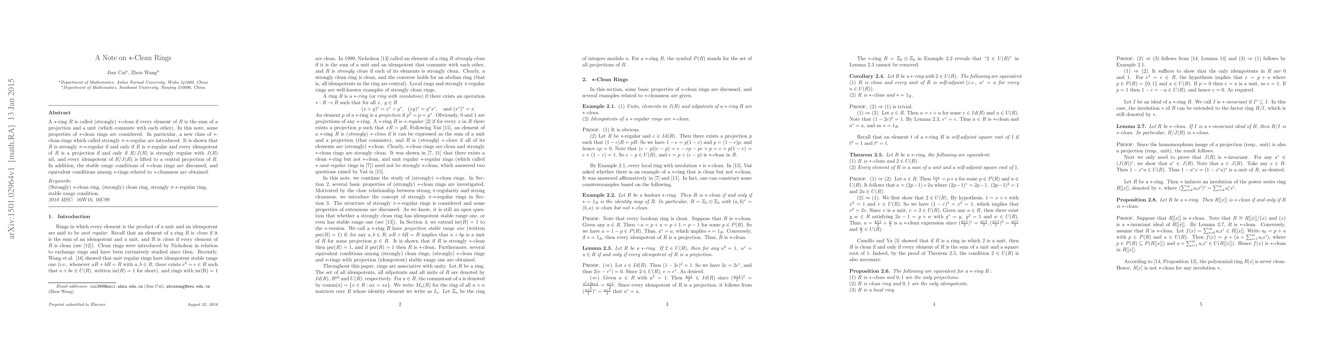 A $*$-ring $R$ is called (strongly) $*$-clean if every element of $R$ is the sum of a projection and a unit (which commute with each other). In this note, some properties of $*$-clean rings are considered. In particular, a new class of $*$-clean rings which called strongly $\pi$-$*$-regular are introduced. It is shown that $R$ is strongly $\pi$-$*$-regular if and only if $R$ is $\pi$-regular and every idempotent of $R$ is a projection if and only if $R/J(R)$ is strongly regular with $J(R)$ nil, and every idempotent of $R/J(R)$ is lifted to a central projection of $R.$ In addition, the stable range conditions of $*$-clean rings are discussed, and equivalent conditions among $*$-rings related to $*$-cleanness are obtained.