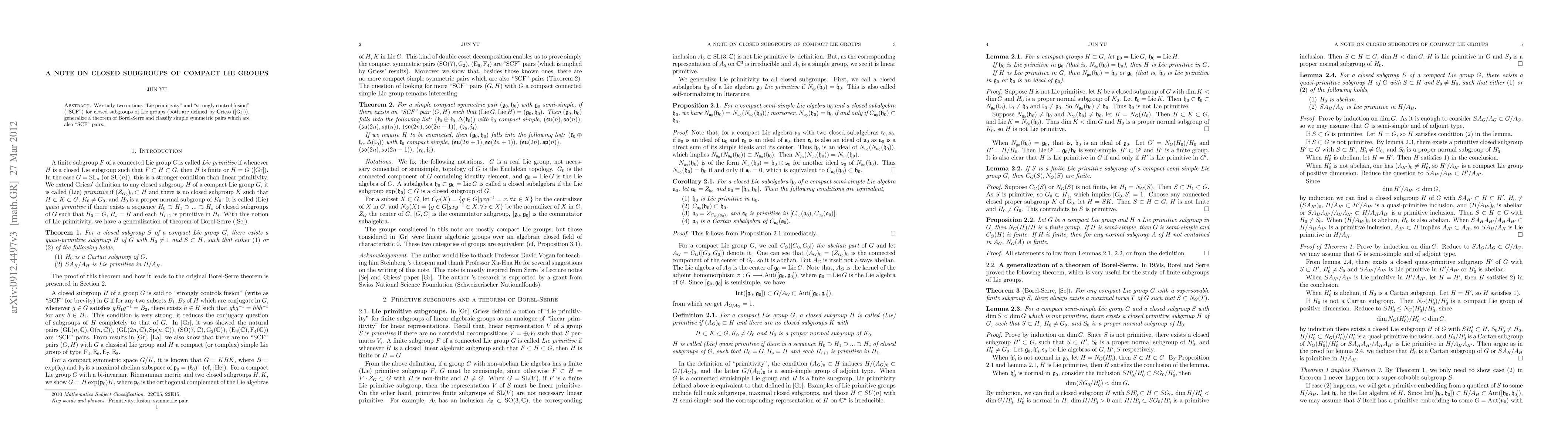 We reduce the classification of finite subgroups in compact Lie groups to that of quasi-simple ones, prove the number of conjugacy classes is finite and each cojugacy class is Zariski closed in mapping space, and classify "strongly controlling fusions" symmetric pairs.