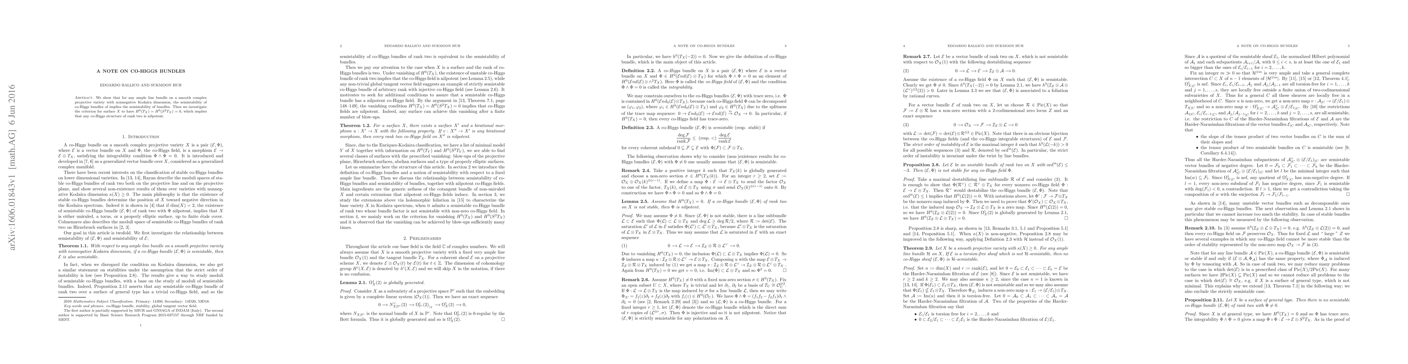 The paper demonstrates that semistability of co-Higgs bundles on a smooth projective variety with nonnegative Kodaira dimension implies the semistability of underlying bundles. It further explores conditions under which rank two co-Higgs structures on surfaces are nilpotent.