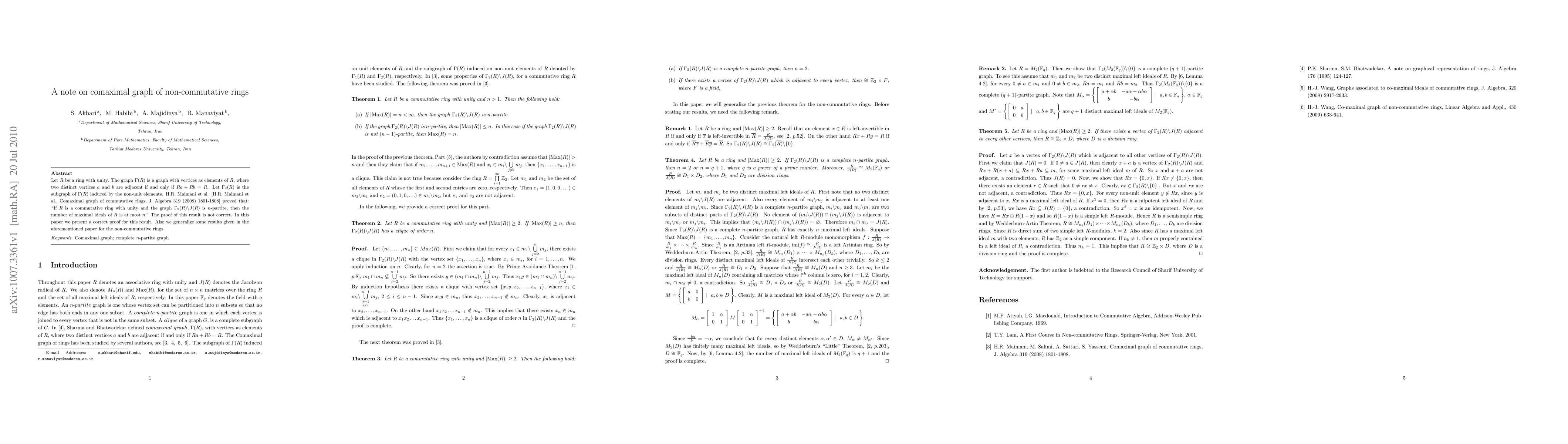 Let $R$ be a ring with unity. The graph $\Gamma(R)$ is a graph with vertices as elements of $R$, where two distinct vertices $a$ and $b$ are adjacent if and only if $Ra+Rb=R$. Let $\Gamma_2(R)$ is the subgraph of $\Gamma(R)$ induced by the non-unit elements. H.R. Maimani et al. [H.R. Maimani et al., Comaximal graph of commutative rings, J. Algebra $319$ $(2008)$ $1801$-$1808$] proved that: ``If $R$ is a commutative ring with unity and the graph $\Gamma_2(R)\backslash J(R)$ is $n$-partite, then the number of maximal ideals of $R$ is at most $n$." The proof of this result is not correct. In this paper we present a correct proof for this result. Also we generalize some results given in the aforementioned paper for the non-commutative rings.