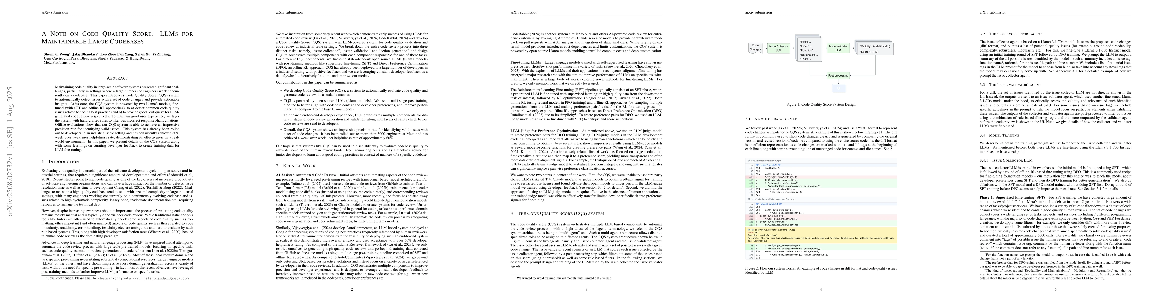 Maintaining code quality in large-scale software systems presents significant challenges, particularly in settings where a large numbers of engineers work concurrently on a codebase. This paper introduces Code Quality Score (CQS) system to automatically detect issues with a set of code changes and provide actionable insights. At its core, the CQS system is powered by two Llama3 models, fine-tuned (with SFT and offline RL approaches), to a) detect common code quality issues related to coding best practices and b) to provide good ``critiques'' for LLM-generated code review respectively. To maintain good user experience, we layer the system with hand-crafted rules to filter out incorrect responses/hallucinations. Offline evaluations show that our CQS system is able to achieve an impressive precision rate for identifying valid issues. This system has already been rolled out to developers in an industrial scale setting and has consistently achieved 60\% week over week user helpfulness rate, demonstrating its effectiveness in a real-world environment. In this paper, we present details of the CQS system along with some learnings on curating developer feedback to create training data for LLM fine-tuning.
