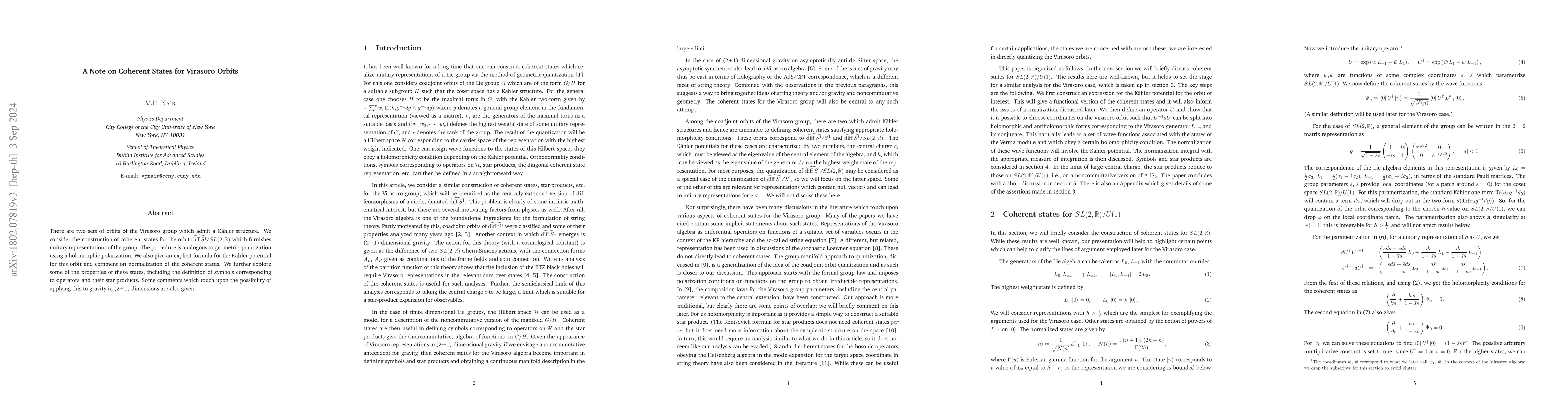 There are two sets of orbits of the Virasoro group which admit a Kahler structure. We consider the construction of coherent states on these orbits which furnish unitary representations of the group. The procedure is equivalent to geometric quantization using a holomorphic polarization. We explore some of the properties of these states, including the definition of symbols corresponding to operators and their star products. The possibility of applying this to gravity in 2+1 dimensions is also briefly discussed.