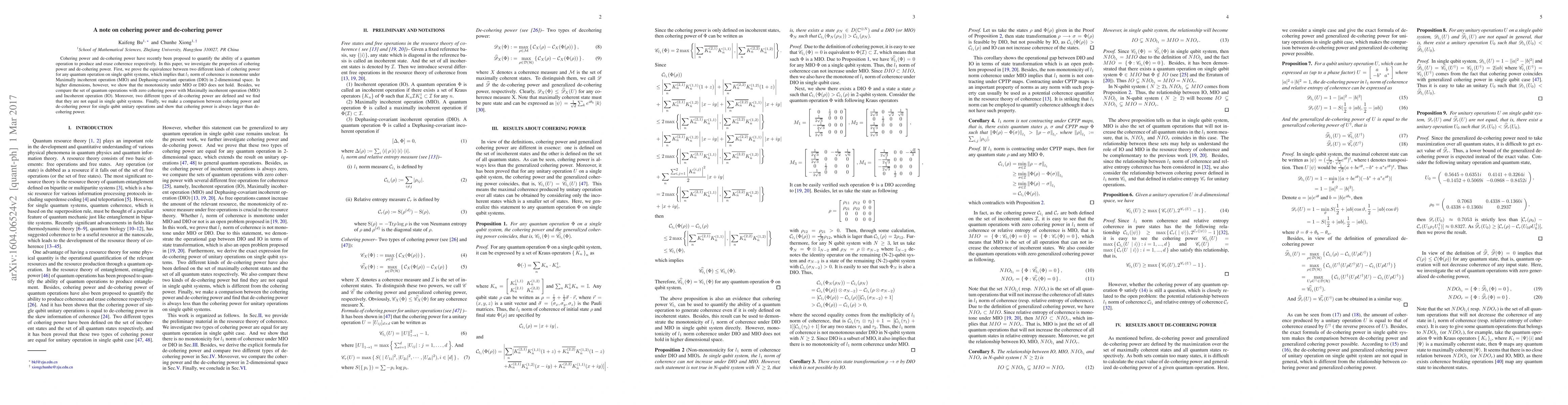 This paper explores the properties of cohering and de-cohering powers in quantum operations, proving their equivalence in single qubit systems and demonstrating monotonicity under specific operations. It also reveals differences in higher dimensions and compares cohering and de-cohering powers for single qubit unitary operations, showing cohering power always exceeds de-cohering power.