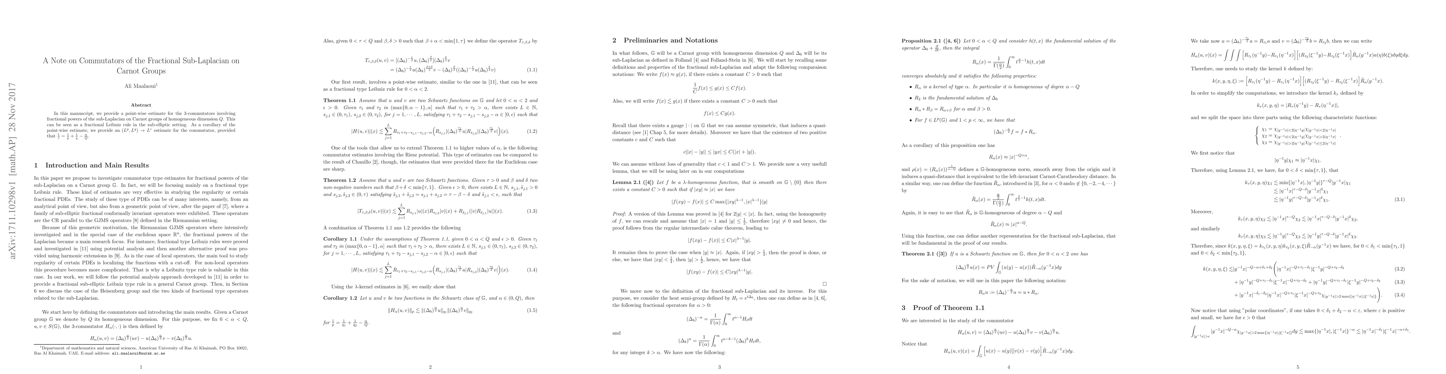 In this manuscript, we provide a point-wise estimate for the $3$-commutators involving fractional powers of the sub-Laplacian on Carnot groups of homogeneous dimension $Q$. This can be seen as a fractional Leibniz rule in the sub-elliptic setting. As a corollary of the point-wise estimate, we provide an $(L^{p},L^{q})\to L^{r}$ estimate for the commutator, provided that $\frac{1}{r}=\frac{1}{p}+\frac{1}{q}-\frac{\alpha}{Q}$.