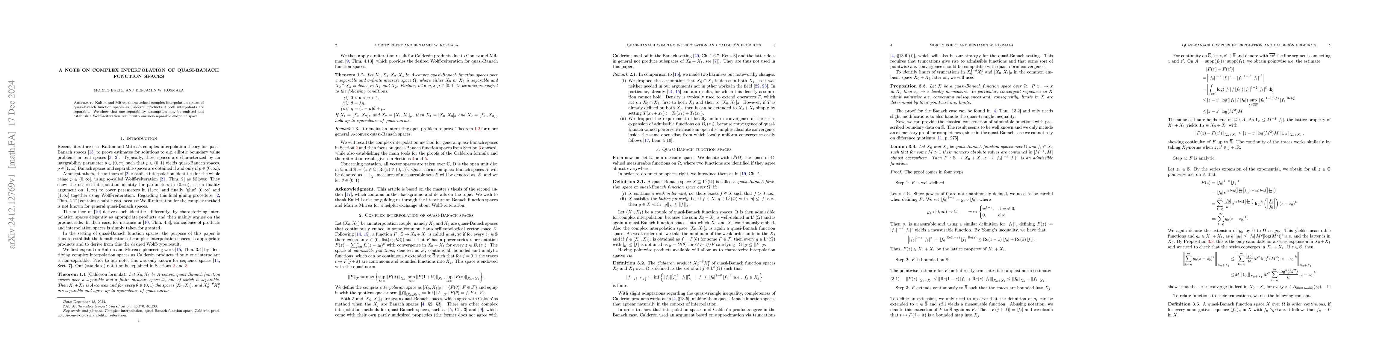Summary: This paper extends the characterization of complex interpolation for quasi-Banach function spaces, previously limited to separable spaces, by demonstrating that one separability assumption can be dropped and presenting a Wolff-reiteration result involving a non-separable endpoint space.