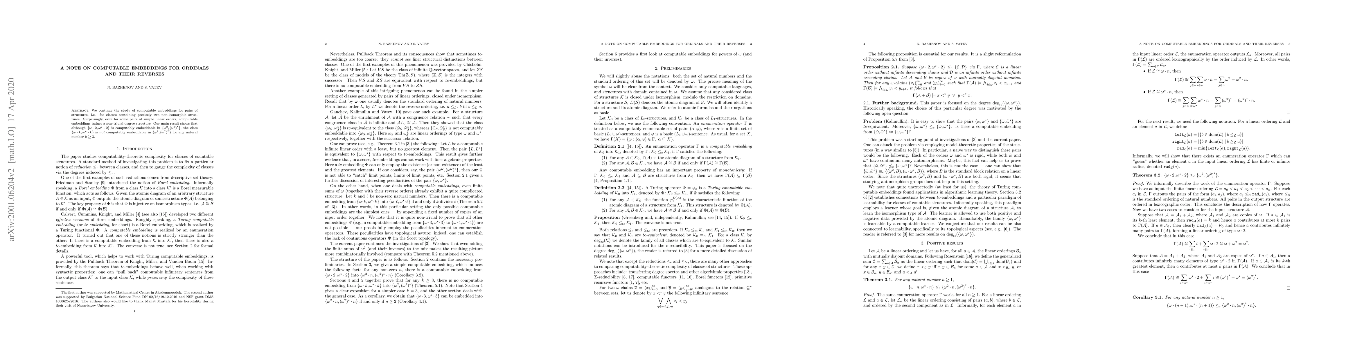 We continue the study of computable embeddings for pairs of structures, i.e. for classes containing precisely two non-isomorphic structures. Surprisingly, even for some pairs of simple linear orders, computable embeddings induce a non-trivial degree structure. Our main result shows that although $\{\omega \cdot 2, \omega^\star \cdot 2\}$ is computably embeddable in $\{\omega^2, {(\omega^2)}^\star\}$, the class $\{\omega \cdot k,\omega^\star \cdot k\}$ is \emph{not} computably embeddable in $\{\omega^2, {(\omega^2)}^\star\}$ for any natural number $k \geq 3$.