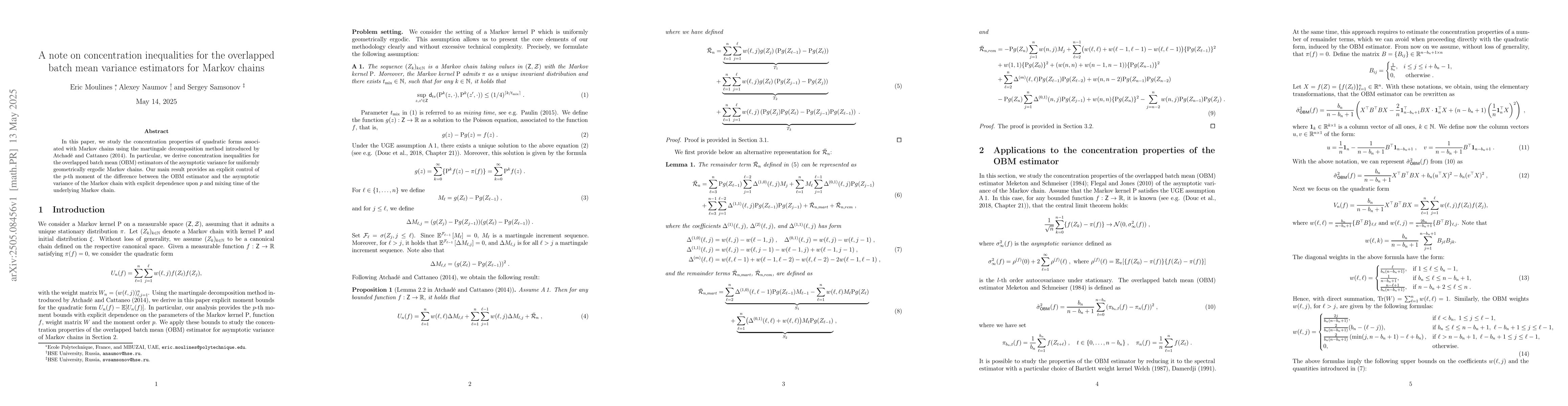This paper derives concentration inequalities for overlapped batch mean estimators in Markov chains, providing explicit control over the p-th moment of the difference between the estimator and the asymptotic variance.