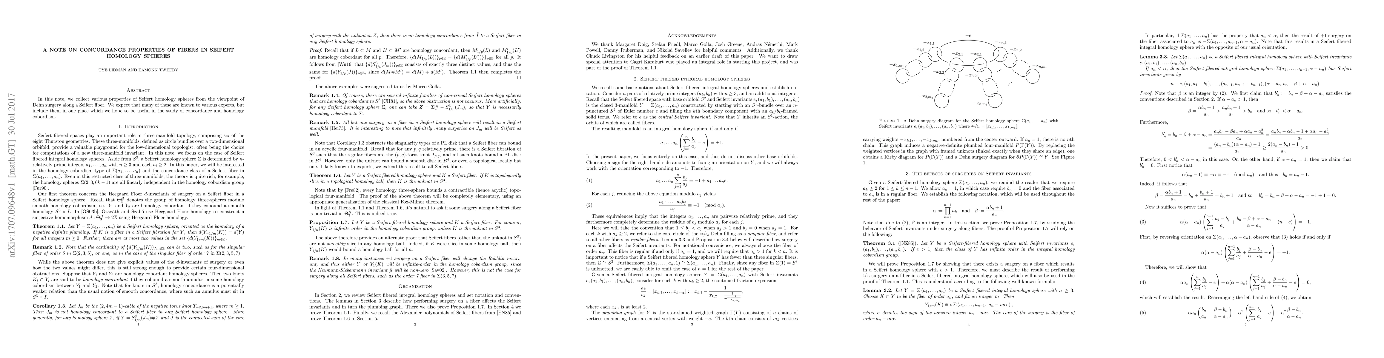 This paper summarizes known properties of Seifert homology spheres concerning Dehn surgery along Seifert fibers, aiming to consolidate these insights for further study in concordance and homology cobordism. The focus is on the implications of Seifert fiber structures in the context of 3-manifolds.