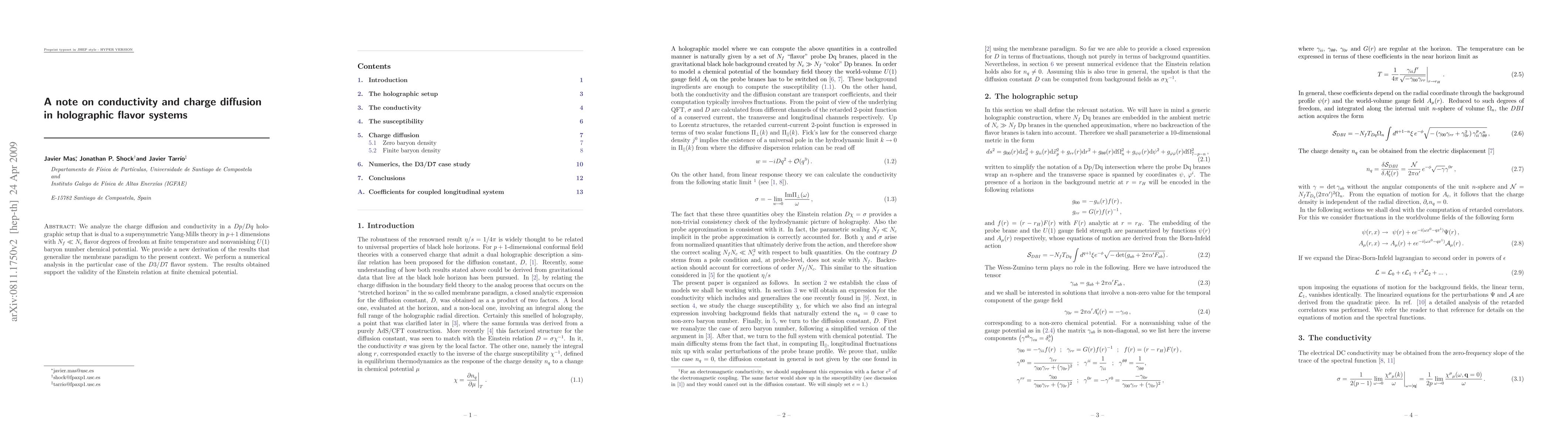 We analyze the charge diffusion and conductivity in a Dp/Dq holographic setup that is dual to a supersymmetric Yang-Mills theory in p+1 dimensions with N_f<< N_c flavour degrees of freedom at finite temperature and nonvanishing U(1) baryon number chemical potential. We provide a new derivation of the results that generalize the membrane paradigm to the present context. We perform a numerical analysis in the particular case of the D3/D7 flavor system. The results obtained support the validity of the Einstein relation at finite chemical potential.