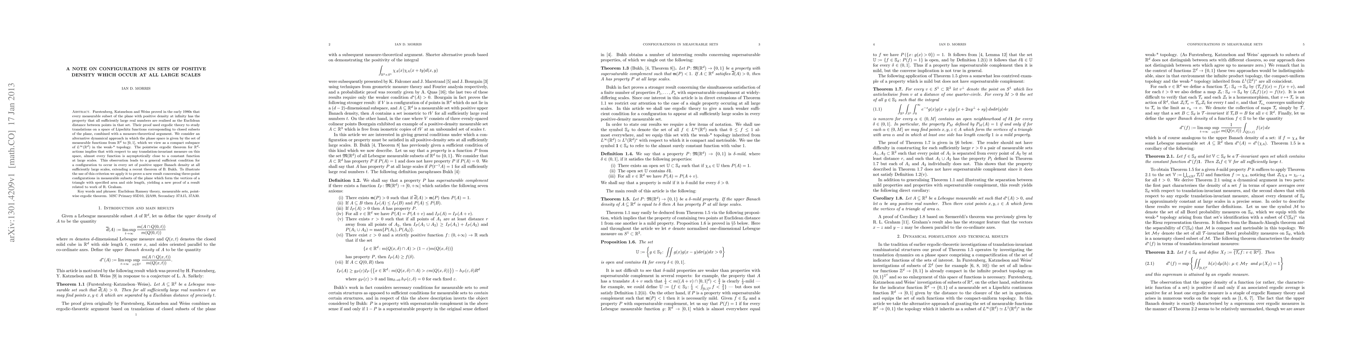 Furstenberg, Katznelson and Weiss proved in the early 1980s that every measurable subset of the plane with positive density at infinity has the property that all sufficiently large real numbers are realised as the Euclidean distance between points in that set. Their proof used ergodic theory to study translations on a space of Lipschitz functions corresponding to closed subsets of the plane, combined with a measure-theoretical argument. We consider an alternative dynamical approach in which the phase space is given by the set of measurable functions from $\mathbb{R}^d$ to $[0,1]$, which we view as a compact subspace of $L^\infty(\mathbb{R}^d)$ in the weak-* topology. The pointwise ergodic theorem for $\mathbb{R}^d$-actions implies that with respect to any translation-invariant measure on this space, almost every function is asymptotically close to a constant function at large scales. This observation leads to a general sufficient condition for a configuration to occur in every set of positive upper Banach density at all sufficiently large scales, extending a recent theorem of B. Bukh. To illustrate the use of this criterion we apply it to prove a new result concerning three-point configurations in measurable subsets of the plane which form the vertices of a triangle with specified area and side length, yielding a new proof of a result related to work of R. Graham.