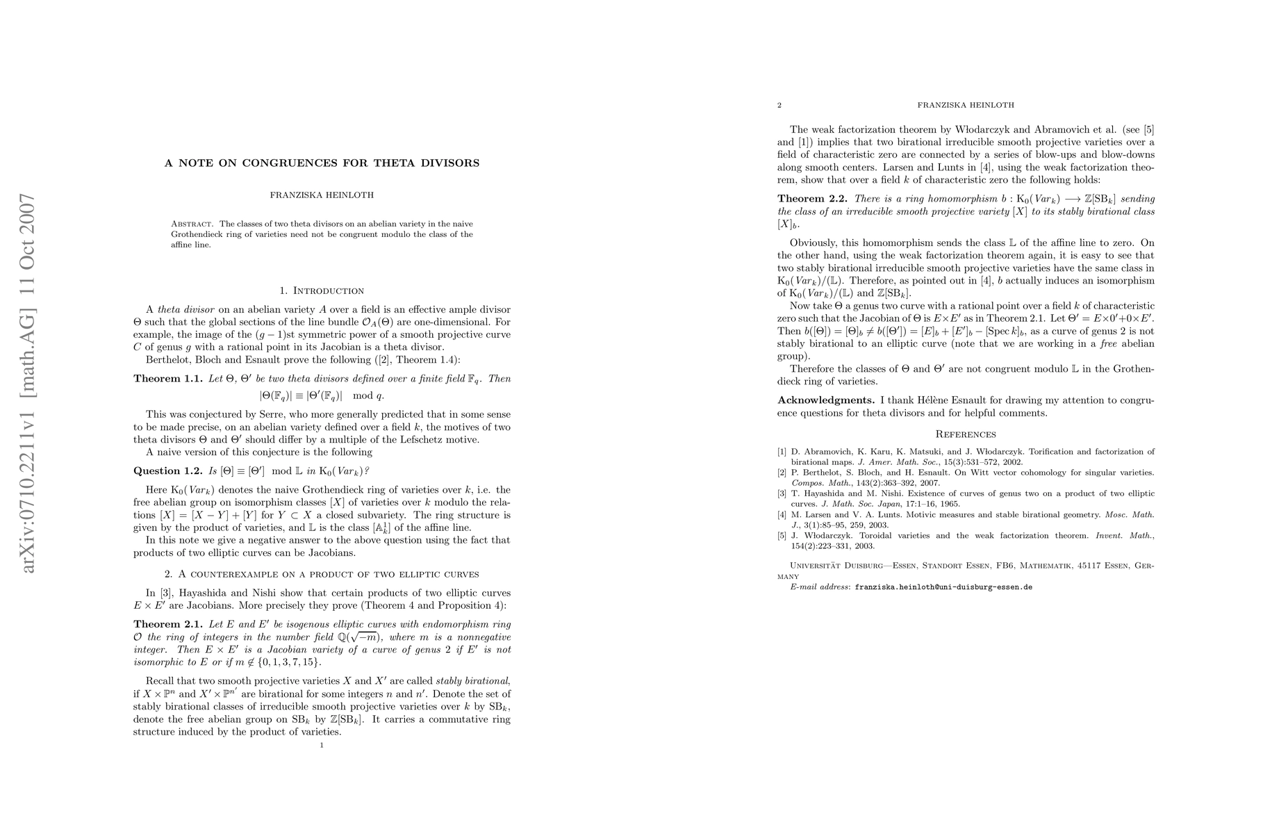 Summary: This paper discusses that the classes of two theta divisors on an abelian variety do not necessarily satisfy congruence in the naive Grothendieck ring of varieties when reduced modulo the class of the affine line. It highlights a nuanced aspect of the arithmetic properties of these divisors.