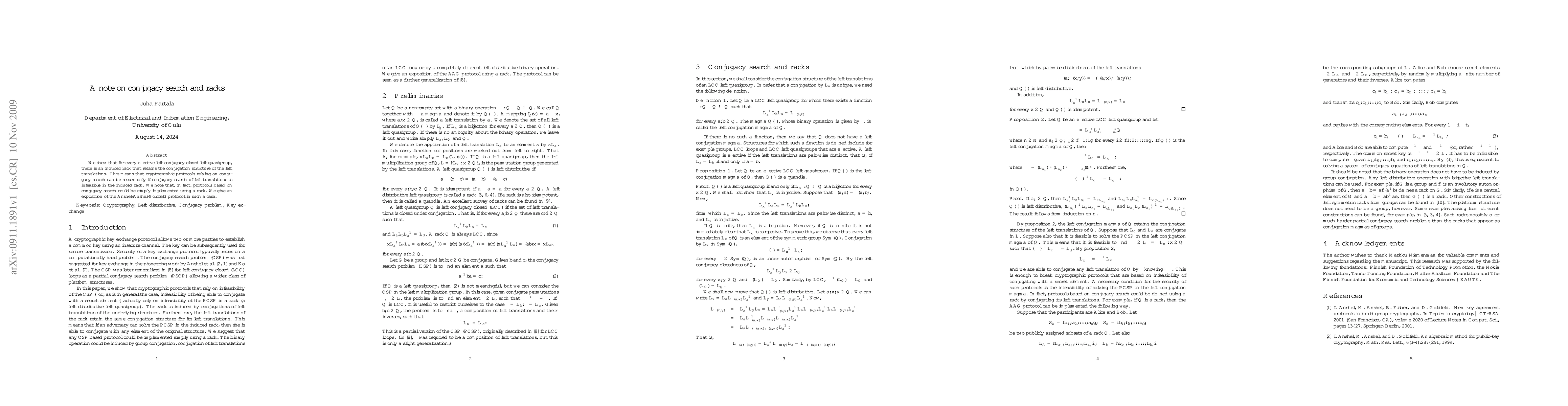 We show that for every effective left conjugacy closed left quasigroup, there is an induced rack that retains the conjugation structure of the left translations. This means that cryptographic protocols relying on conjugacy search can be secure only if conjugacy search of left translations is infeasible in the induced rack. We note that, in fact, protocols based on conjugacy search could be simply implemented using a rack. We give an exposition of the Anshel-Anshel-Goldfeld protocol in such a case.