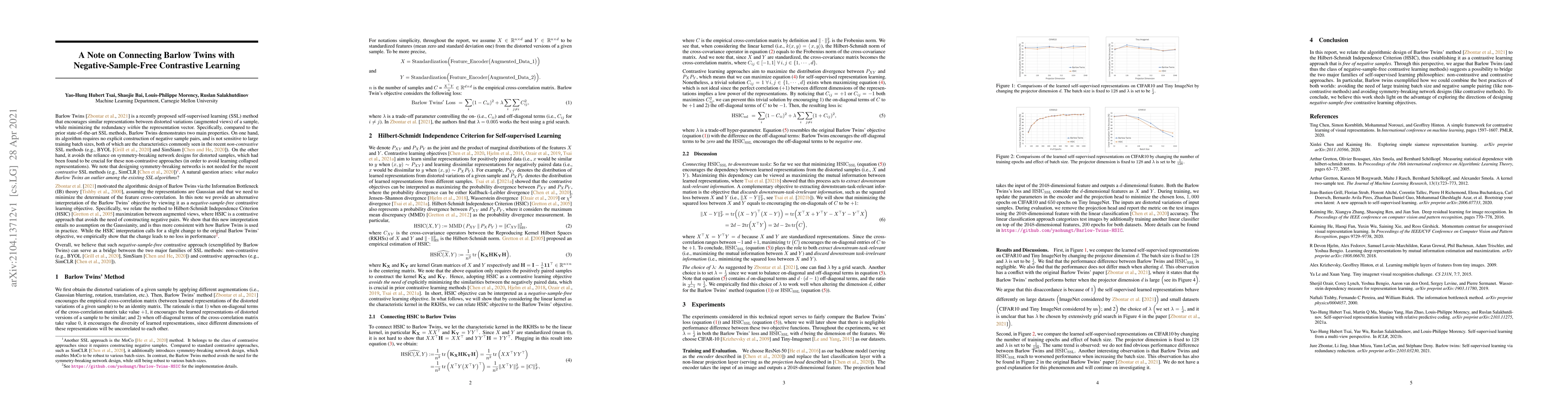 This paper connects Barlow Twins' method to the Hilbert-Schmidt Independence Criterion (HSIC), positioning it as a negative-sample-free contrastive learning approach. It argues that Barlow Twins can bridge non-contrastive and contrastive self-supervised learning philosophies by combining their best practices without requiring large batch sizes or negative sample pairs.