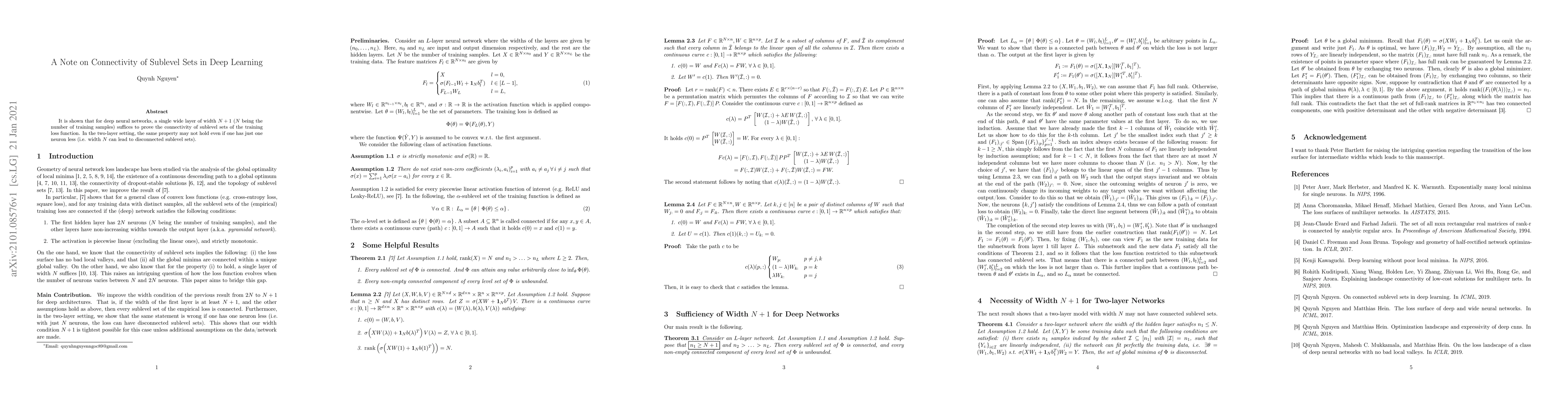 It is shown that for deep neural networks, a single wide layer of width $N+1$ ($N$ being the number of training samples) suffices to prove the connectivity of sublevel sets of the training loss function. In the two-layer setting, the same property may not hold even if one has just one neuron less (i.e. width $N$ can lead to disconnected sublevel sets).