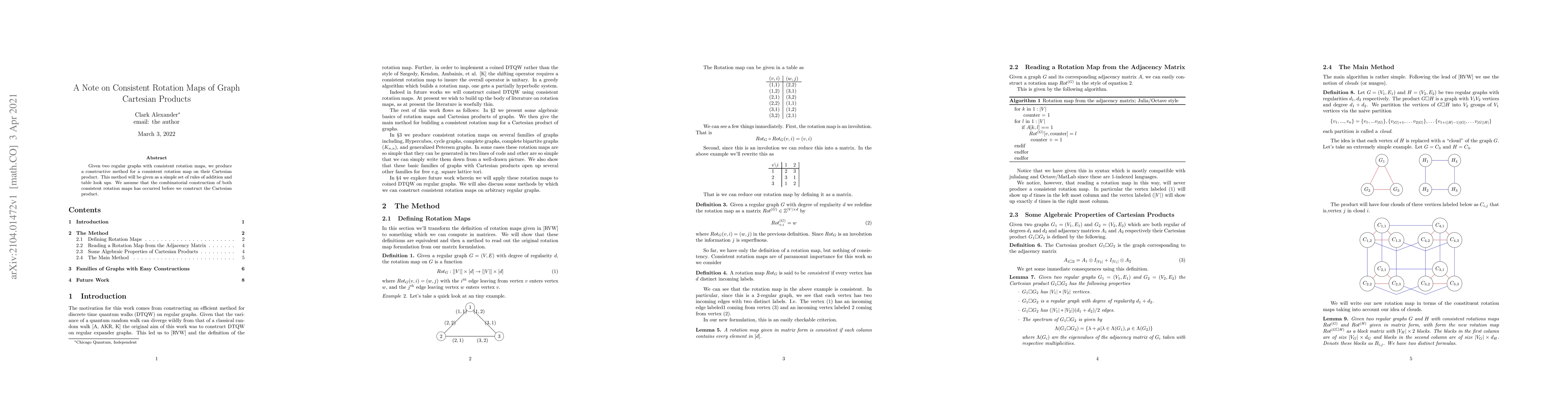 Summary: This paper presents a method for creating a consistent rotation map on the Cartesian product of two regular graphs, given their existing consistent rotation maps, through a set of straightforward addition rules and table lookups. The construction assumes prior combinatorial construction of the individual rotation maps.