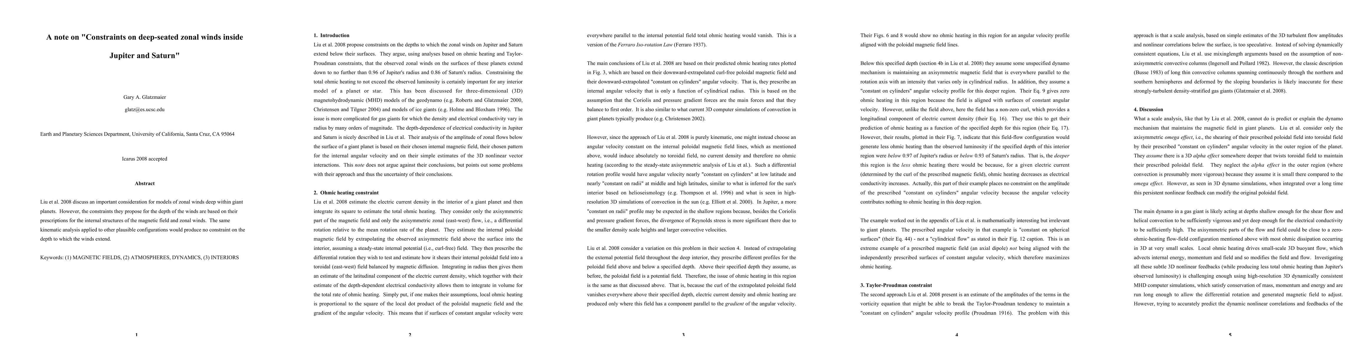 Summary: Liu et al. (2008) propose constraints on deep-seated zonal winds in Jupiter and Saturn, but these constraints rely on specific assumptions about internal magnetic fields and wind structures; alternative configurations could yield no such constraints.