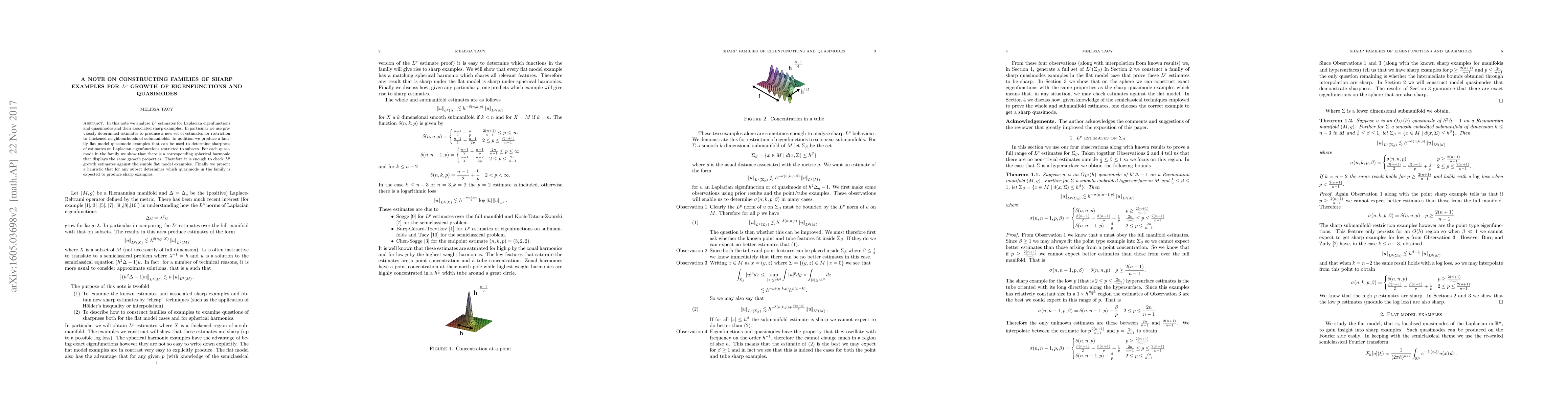 In this note we analyse $L^{p}$ estimates for Laplacian eigenfunctions and quasimodes and their associated sharp examples. In particular we use previously determined estimates to produce a new set of estimates for restriction to thickened neighbourhoods of submanifolds. In addition we produce a family flat model quasimode examples that can be used to determine sharpness of estimates on Laplacian eigenfunctions restricted to subsets. For each quasimode in the family we show that there is a corresponding spherical harmonic that displays the same growth properties. Therefore it is enough to check $L^{p}$ growth estimates against the simple flat model examples. Finally we present a heuristic that for any subset determines which quasimode in the family is expected to produce sharp examples.