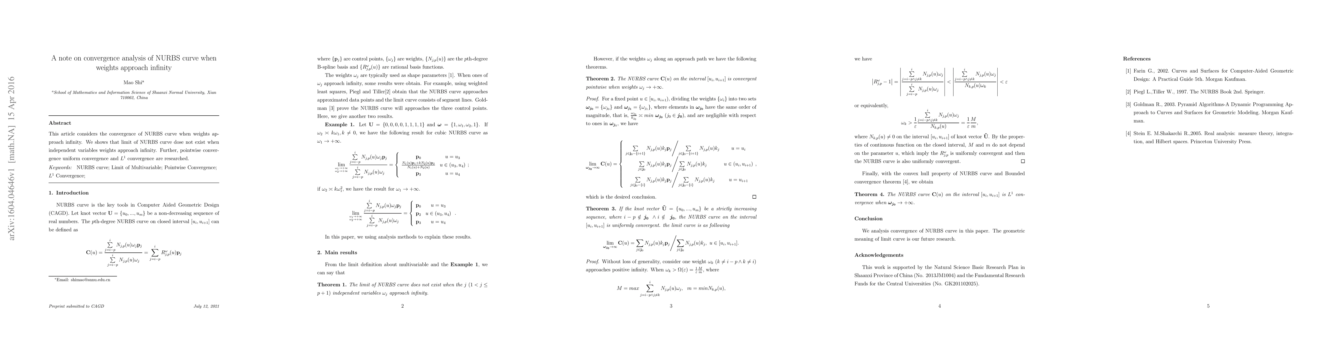 This article considers the convergence of NURBS curve when weights approach infinity. We shows that limit of NURBS curve dose not exist when independent variables weights approach infinity. Further, pointwise convergence uniform convergence and $L^1$ convergence are researched.