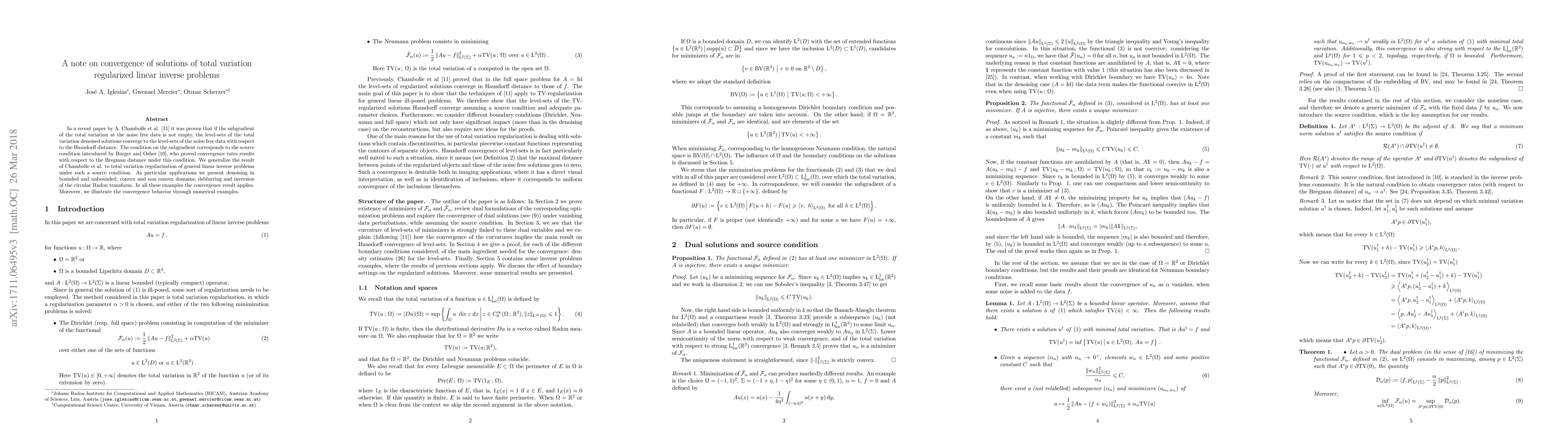 This paper generalizes the convergence results of total variation denoised solutions to total variation regularized linear inverse problems under a source condition. It demonstrates convergence to noise-free data in various applications, including denoising and deblurring, and supports findings with numerical examples.