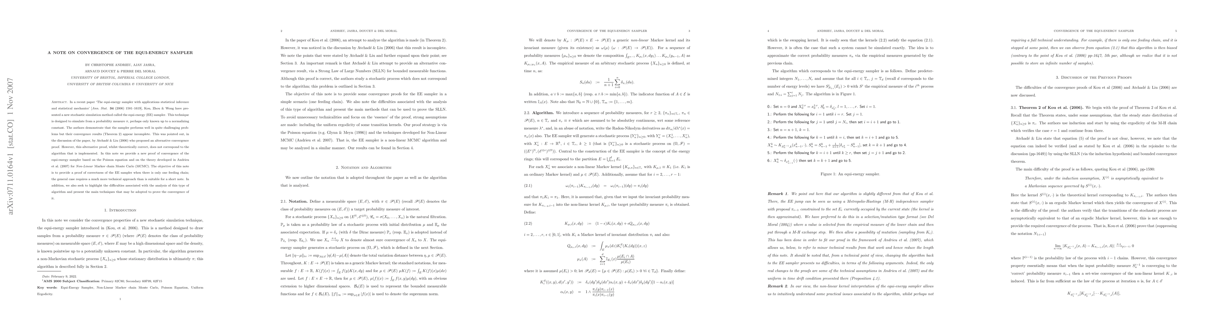 In a recent paper `The equi-energy sampler with applications statistical inference and statistical mechanics' [Ann. Stat. 34 (2006) 1581--1619], Kou, Zhou & Wong have presented a new stochastic simulation method called the equi-energy (EE) sampler. This technique is designed to simulate from a probability measure $\pi$, perhaps only known up to a normalizing constant. The authors demonstrate that the sampler performs well in quite challenging problems but their convergence results (Theorem 2) appear incomplete. This was pointed out, in the discussion of the paper, by Atchad\'e & Liu (2006) who proposed an alternative convergence proof. However, this alternative proof, whilst theoretically correct, does not correspond to the algorithm that is implemented. In this note we provide a new proof of convergence of the equi-energy sampler based on the Poisson equation and on the theory developed in Andrieu et al. (2007) for \emph{Non-Linear} Markov chain Monte Carlo (MCMC). The objective of this note is to provide a proof of correctness of the EE sampler when there is only one feeding chain; the general case requires a much more technical approach than is suitable for a short note. In addition, we also seek to highlight the difficulties associated with the analysis of this type of algorithm and present the main techniques that may be adopted to prove the convergence of it.
