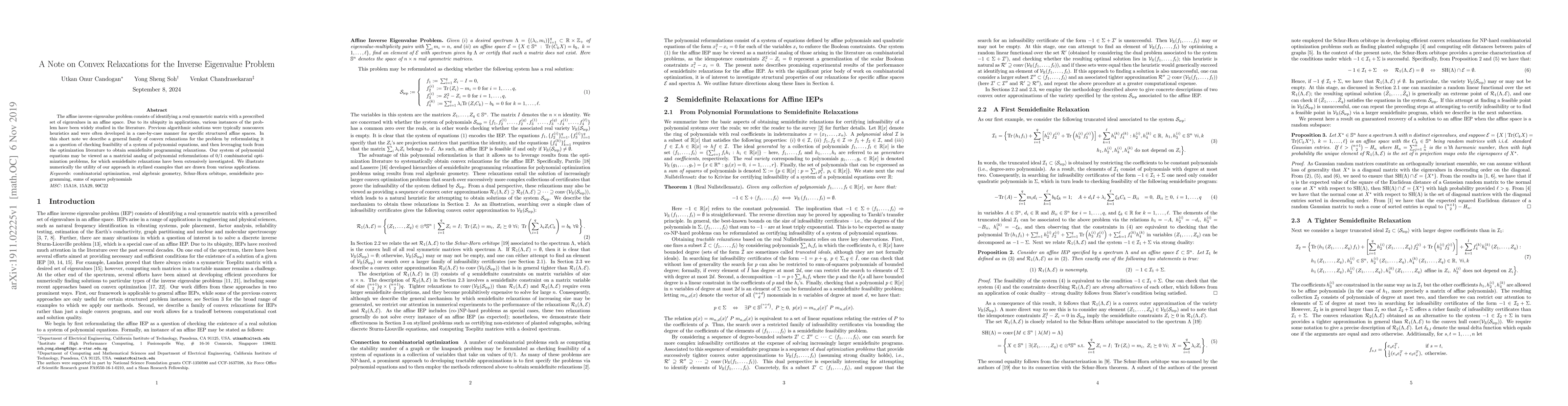 This paper presents a new family of convex relaxations for solving the affine inverse eigenvalue problem, reformulating it as a feasibility problem of polynomial equations. The authors leverage semidefinite programming to tackle the problem, demonstrating its effectiveness through numerical examples from various applications.