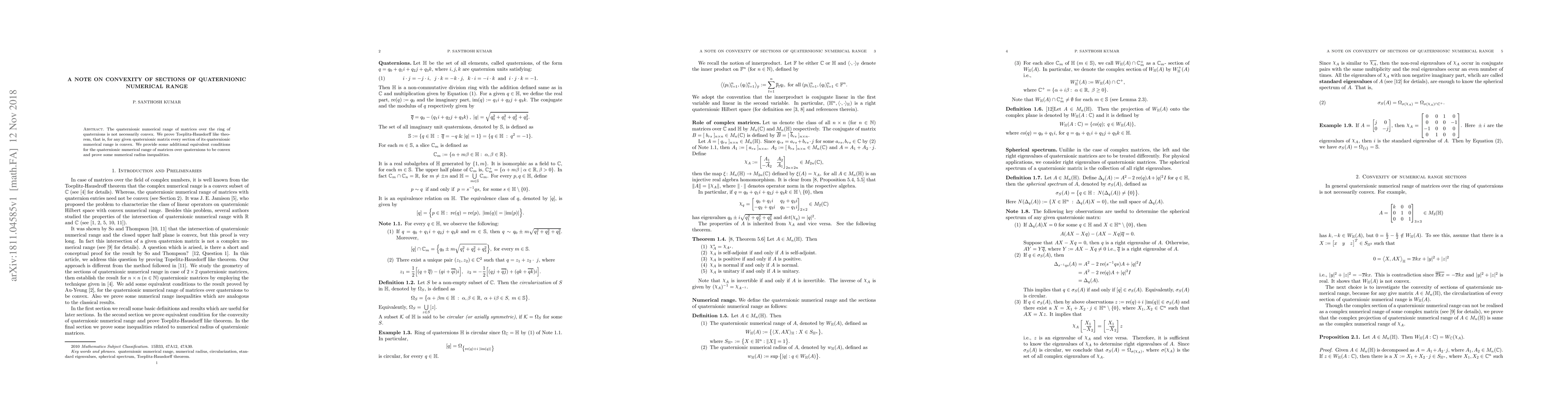 The quaternionic numerical range of matrices over the ring of quaternions is not necessarily convex. We prove Toeplitz-Hausdorff like theorem, that is, for any given quaternionic matrix every section of its quaternionic numerical range is convex. We provide some additional equivalent conditions for the quaternionic numerical range of matrices over quaternions to be convex and prove some numerical radius inequalities.