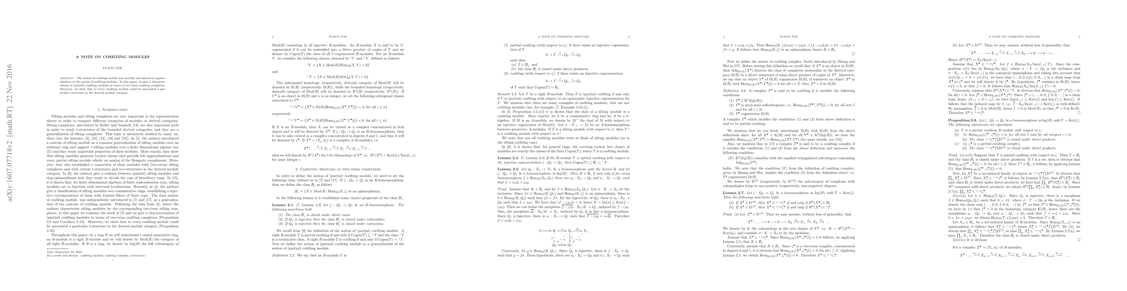 The notion of cosilting module was recently introduced as a generalization of the notion of cotilting module. In this paper, we give a characterization of (partial) cosilting modules in terms of two-term cosilting complexes. Moreover, we show that to every cosilting module could be associated a particular t-structure in the derived module category.
