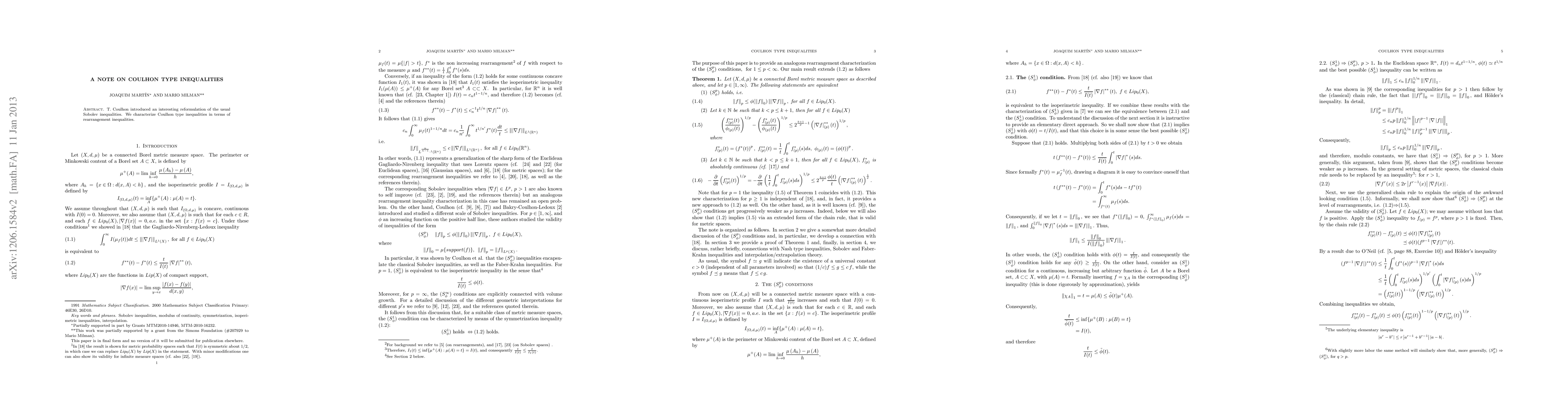 T. Coulhon introduced an interesting reformulation of the usual Sobolev inequalities. We characterize Coulhon type inequalities in terms of rearrangement inequalities.