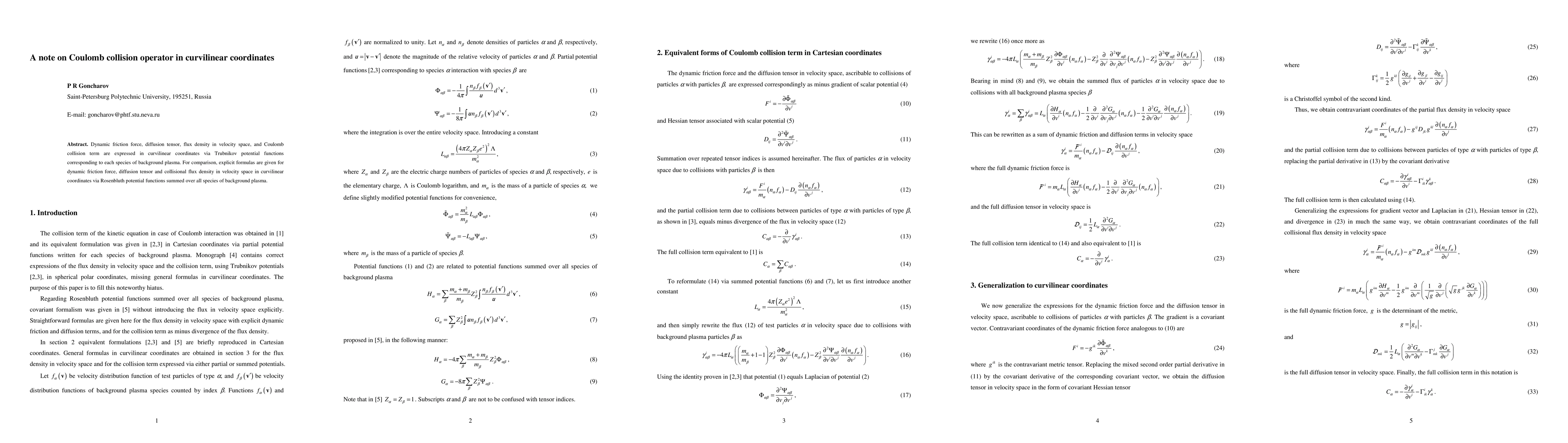 This paper expresses the Coulomb collision operator in curvilinear coordinates using Trubnikov potential functions for individual plasma species and compares it with Rosenbluth potential functions summed over all species for dynamic friction, diffusion tensor, and collisional flux density.