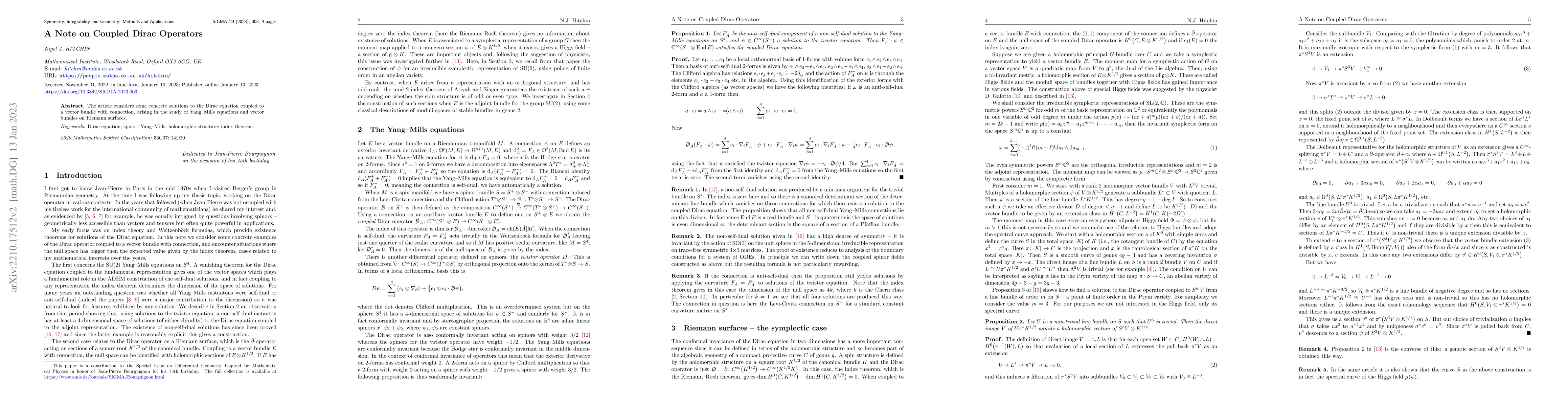 Summary: This paper explores specific solutions to the Dirac equation linked to vector bundles with connections, relevant to the study of Yang-Mills equations and vector bundles on Riemann surfaces. The focus is on the mathematical framework underlying these coupled Dirac operators.