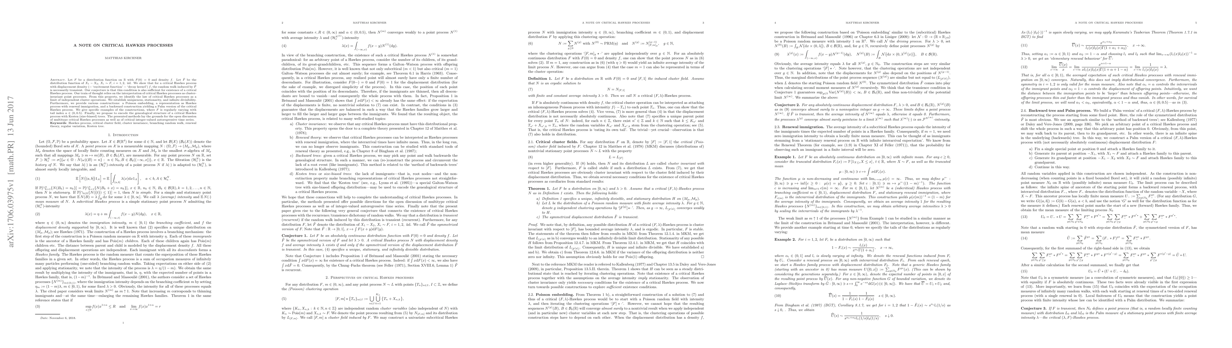 This paper investigates critical Hawkes processes, demonstrating that a random walk induced by their displacement density is transient. The authors propose that this transience condition is both necessary and sufficient for the existence of such processes, interpreting them as cluster-invariant point processes and establishing their uniqueness, stationarity, and infinite divisibility.