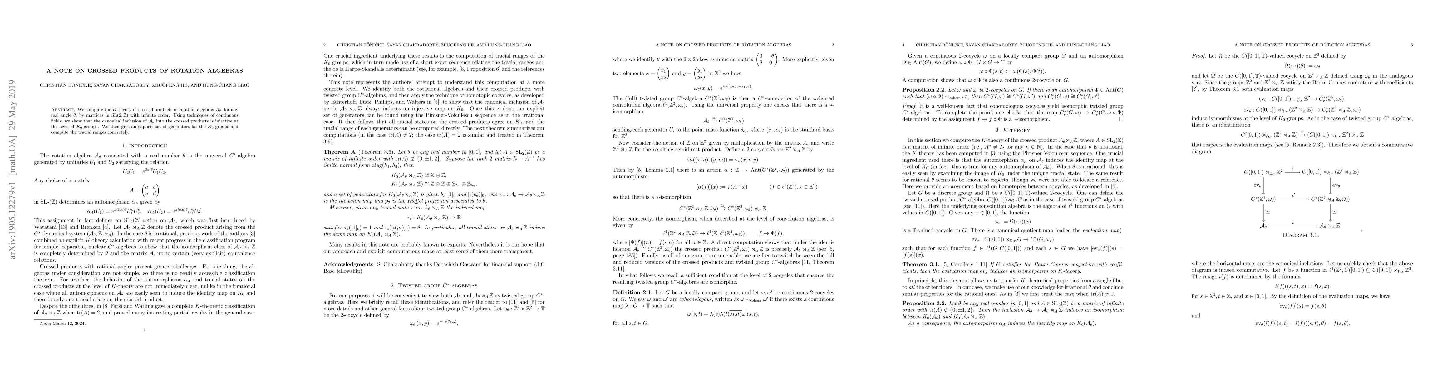 We compute the $K$-theory of crossed products of rotation algebras $\mathcal{A}_\theta$, for any real angle $\theta$, by matrices in $\mathrm{SL}(2,\mathbb{Z})$ with infinite order. Using techniques of continuous fields, we show that the canonical inclusion of $\mathcal{A}_\theta$ into the crossed products is injective at the level of $K_0$-groups. We then give an explicit set of generators for the $K_0$-groups and compute the tracial ranges concretely.