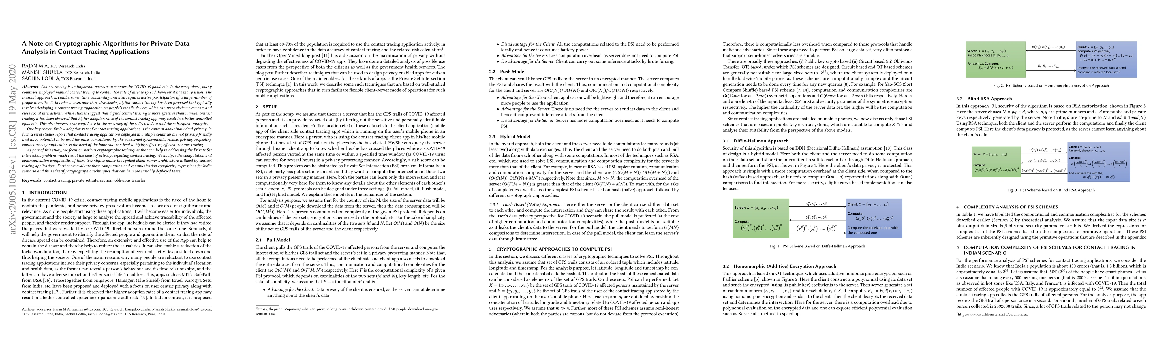 Contact tracing is an important measure to counter the COVID-19 pandemic. In the early phase, many countries employed manual contact tracing to contain the rate of disease spread, however it has many issues. The manual approach is cumbersome, time consuming and also requires active participation of a large number of people to realize it. In order to overcome these drawbacks, digital contact tracing has been proposed that typically involves deploying a contact tracing application on people's mobile devices which can track their movements and close social interactions. While studies suggest that digital contact tracing is more effective than manual contact tracing, it has been observed that higher adoption rates of the contact tracing app may result in a better controlled epidemic. This also increases the confidence in the accuracy of the collected data and the subsequent analytics. One key reason for low adoption rate of contact tracing applications is the concern about individual privacy. In fact, several studies report that contact tracing applications deployed in multiple countries are not privacy friendly and have potential to be used for mass surveillance by the concerned governments. Hence, privacy respecting contact tracing application is the need of the hour that can lead to highly effective, efficient contact tracing. As part of this study, we focus on various cryptographic techniques that can help in addressing the Private Set Intersection problem which lies at the heart of privacy respecting contact tracing. We analyze the computation and communication complexities of these techniques under the typical client-server architecture utilized by contact tracing applications. Further we evaluate those computation and communication complexity expressions for India scenario and thus identify cryptographic techniques that can be more suitably deployed there.