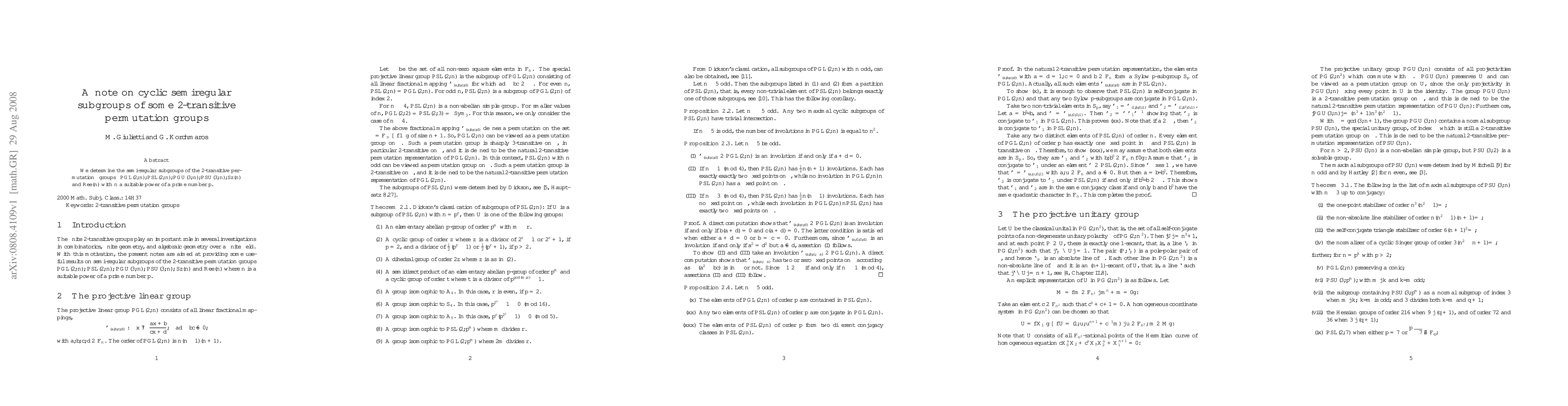 Summary: The paper identifies and analyzes cyclic semiregular subgroups within several 2-transitive permutation groups, specifically PGL(2,n), PSL(2,n), PGU(3,n), PSU(3,n), Sz(n), and Ree(n), where n is a power of a prime number. The focus is on understanding their structure and properties.