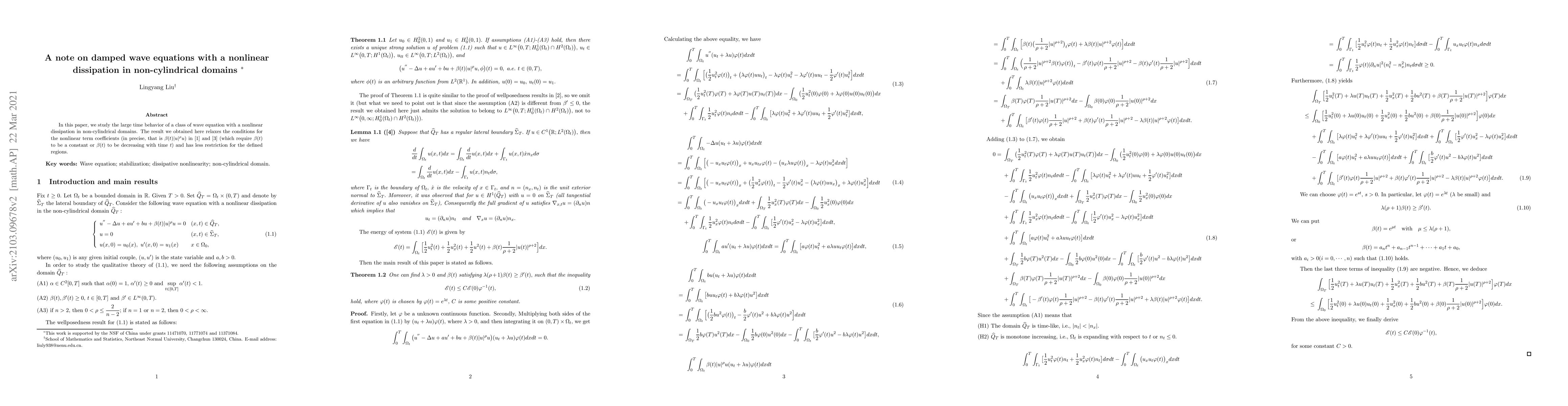 In this paper, we study the large time behavior of a class of wave equation with a nonlinear dissipation in non-cylindrical domains. The result we obtained here relaxes the conditions for the nonlinear term coefficients (in precise, that is $\beta(t)|u|^\rho u$) in \cite{alb} and \cite{ha} (which require $\beta(t)$ to be a constant or $\beta(t)$ to be decreasing with time $t$) and has less restriction for the defined regions.