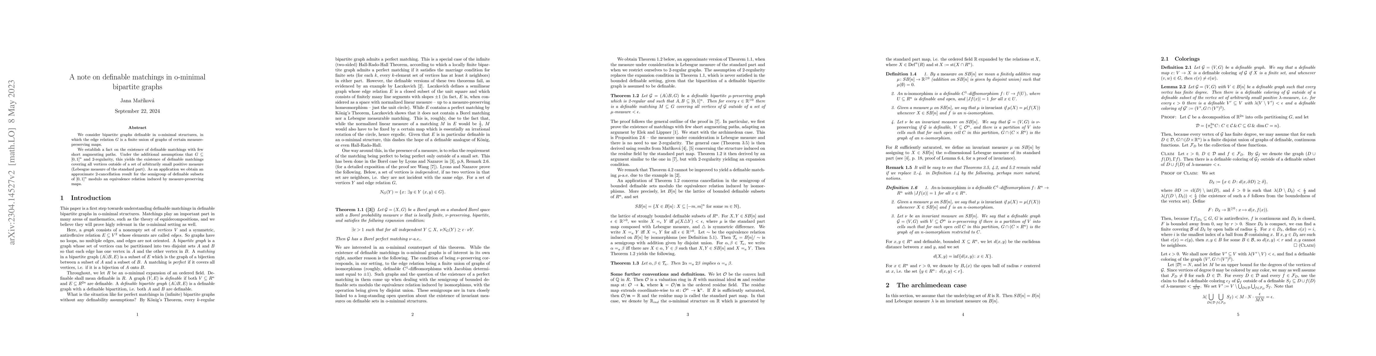 We consider bipartite graphs definable in o-minimal structures, in which the edge relation $G$ is a finite union of graphs of certain measure-preserving maps. We establish a fact on the existence of definable matchings with few short augmenting paths. Under the additional assumptions that $G\subseteq [0,1]^n$ and 2-regularity, this yields the existence of definable matchings covering all vertices outside of a set of arbitrarily small positive measure (Lebesgue measure of the standard part). As an application we obtain an approximate 2-cancellation result for the semigroup of definable subsets of $[0,1]^n$ modulo an equivalence relation induced by measure-preserving maps.