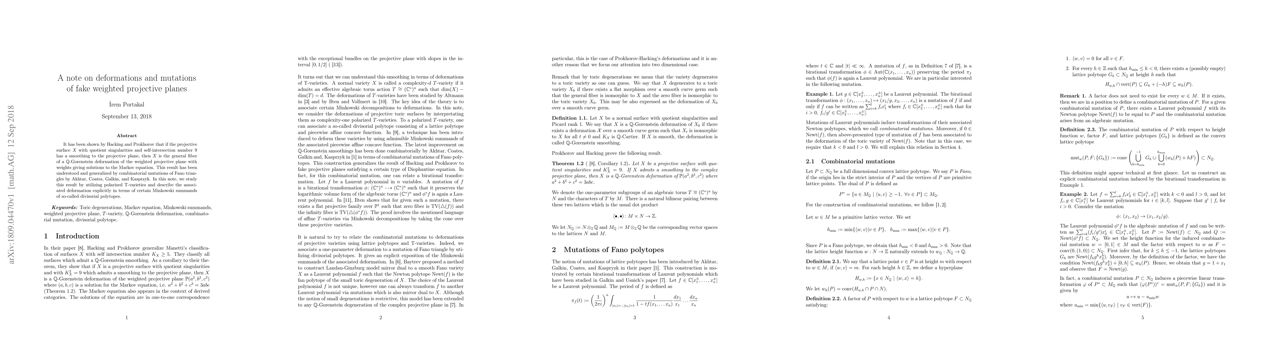 It has been shown by Hacking and Prokhorov that if the projective surface X with quotient singularities and self-intersection number 9 has a smoothing to the projective plane, then X is the general fiber of a Q-Gorenstein deformation of the weighted projective plane with weights giving solutions to the Markov equation. This result has been understood and generalized by combinatorial mutations of Fano triangles by Akhtar, Coates, Galkin, and Kasprzyk. In this note, we study this result by utilizing polarized T-varieties and describe the associated deformation explicitly in terms of certain Minkowski summands of so-called divisorial polytopes.