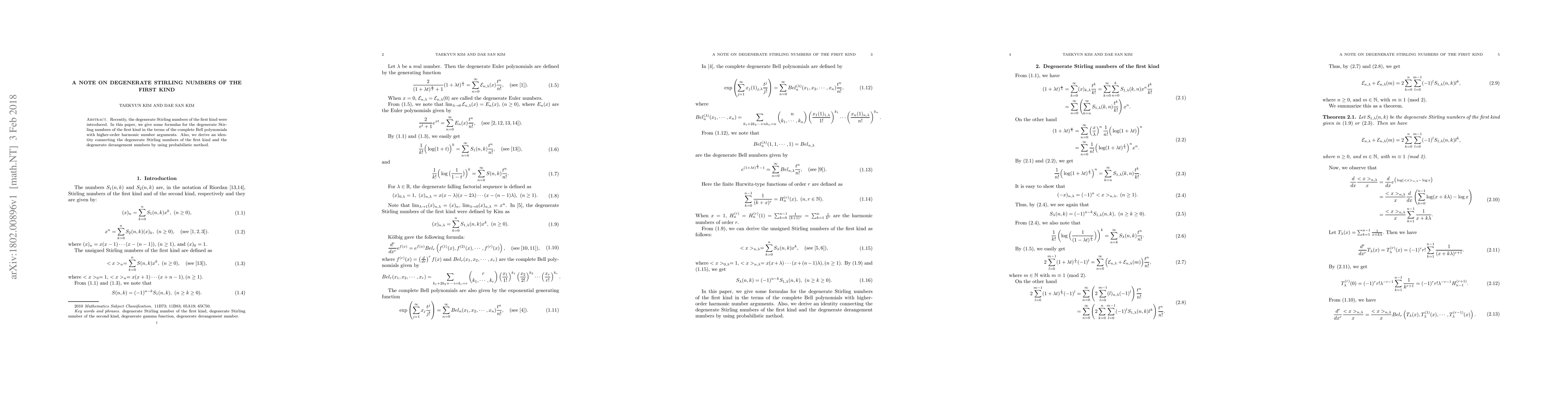 Recently, the degenerate Stirling numbers of the first kind were introduced. In this paper, we give some formulas for the degenerate Stirling numbers of the first kind in the terms of the complete Bell polynomials with higher-order harmonic number arguments. Also, we derive an identity connecting the degenerate Stirling numbers of the first kind and the degenerate derangement numbers by using probabilistic method.