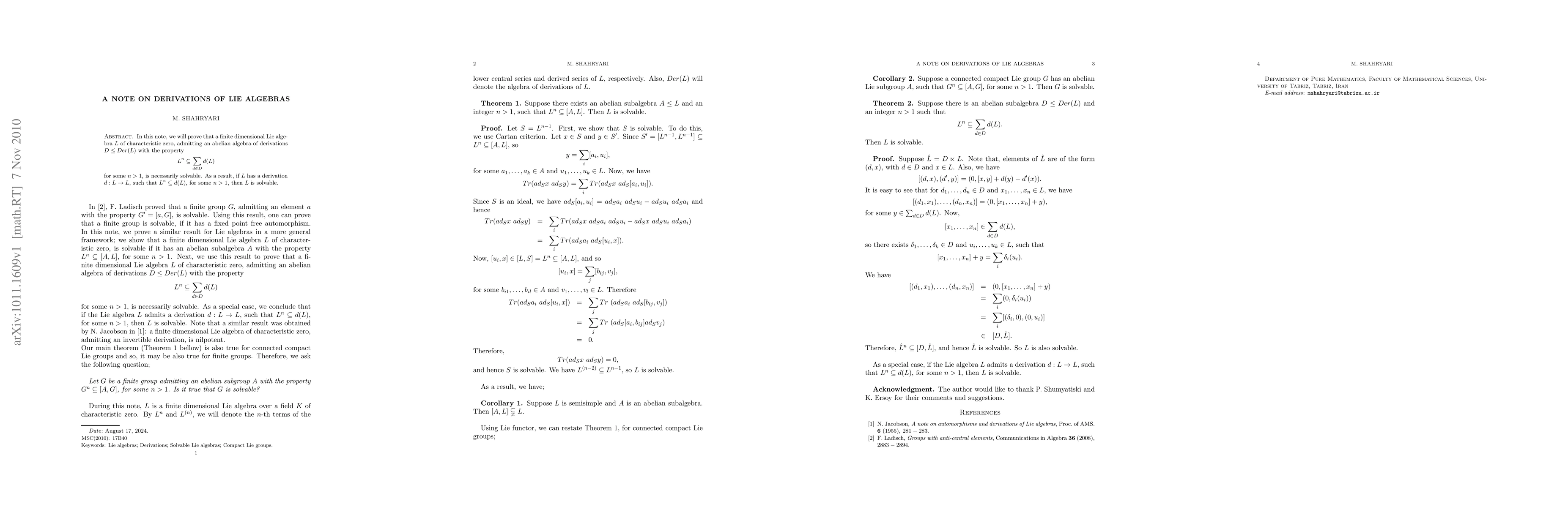 In this note, we will prove that a finite dimensional Lie algebra $L$ of characteristic zero, admitting an abelian algebra of derivations $D\leq Der(L)$ with the property $$ L^n\subseteq \sum_{d\in D}d(L) $$ for some $n\geq 1$, is necessarily solvable. As a result, if $L$ has a derivation $d:L\to L$, such that $L^n\subseteq d(L)$, for some $n\geq 1$, then $L$ is solvable.